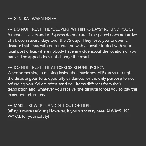 Как в описании. Доставка в 53 dd. • Общее предупреждение • Не доверяйте политике возврата «Доставка в течение 75 дней». Почти все продавцы и AliExpress не заботятся, если посылка не прибыла, даже несколько дней в течение 75 дней. Они заставляют вас открыть спор, который заканчивается без возврата денег и с приглашением справиться с вашим местным почтовым отделением, где никто не имеет ни единого представления о месте вашей посылки. Обращение не влияет на результат. • Не доверяйте политике возврата денег ALIEXPRESS. Когда что-то отсутствует в конвертах, AliExpress через спор идет, чтобы спросить вас, глупы доказательства для только цели, чтобы не возвращать вам деньги. Продавцы часто отправляют вам товары, отличающиеся от их описания, и, независимо от того, что вы получите, спор заставит вас оплатить стоимость возврата. • Сделать как дерево и выйти из него. (eBay более серьезно!) Однако, если вы хотите оставаться здесь, всегда используйте PAYPAL для вашей безопасности!