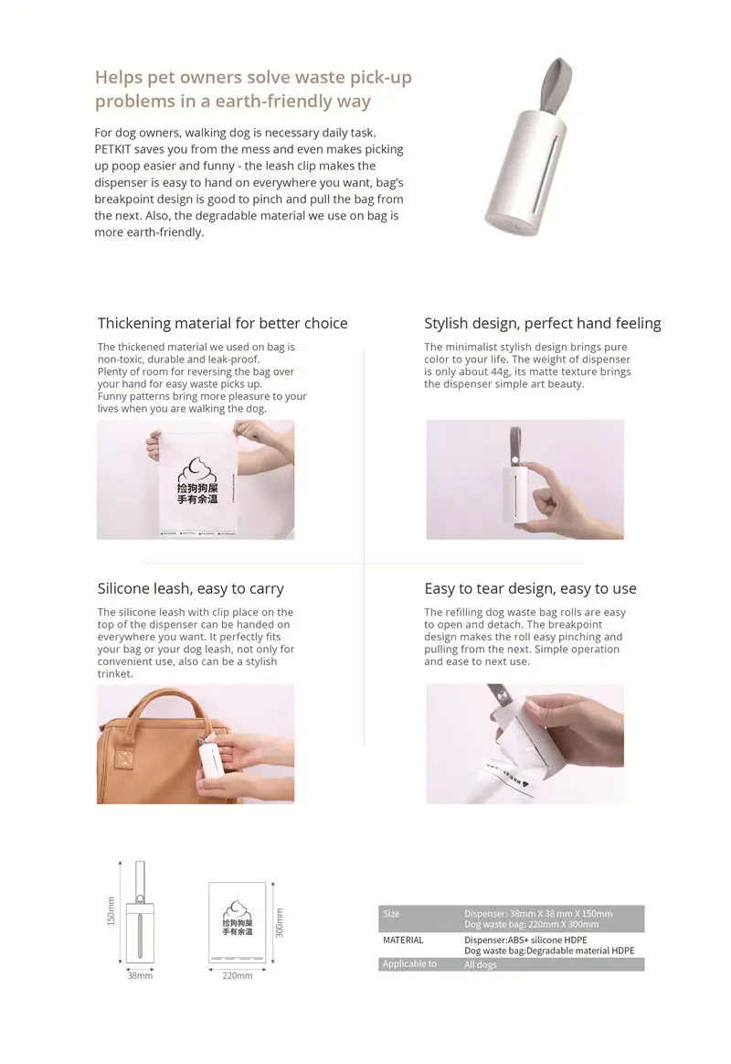 PETKIT портативный дозатор мешков для отходов для собак, дозатор мешков для собак, щенков, совок для очистки разлагаемые пакеты