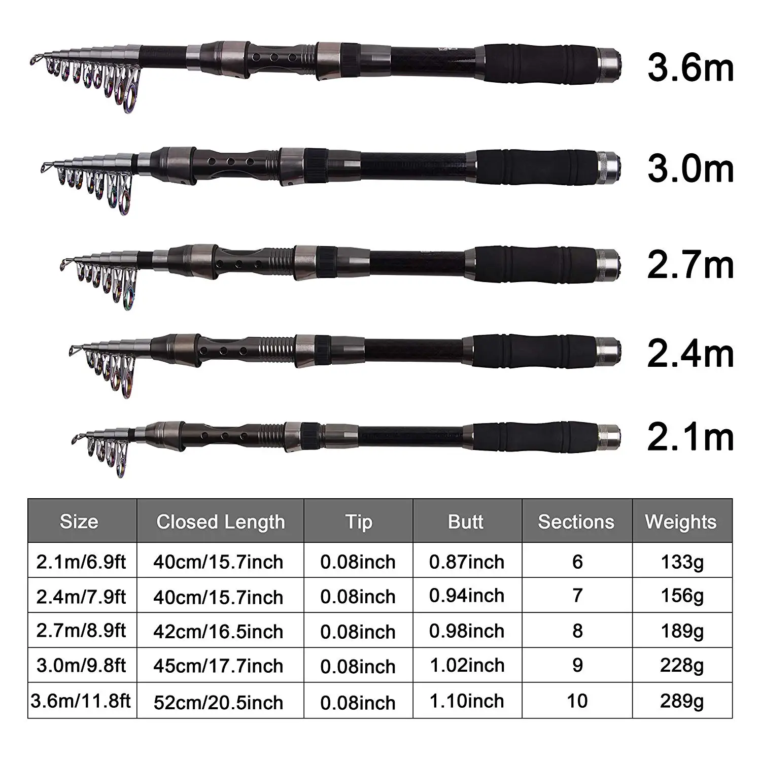 Длина Удилища: 2,1 м, 2,4 м, 2,7 м, 3,0 м, 3,6 м Материал стержня: карбон firber Модель катушки: EF3000 Цвет рыболовной сумки: черный/Камуфляж Рыболовные снасти: 7 шт твердые приманки 1 шт. ножницы для лески Леска 100 м Примечание: Измерение может иметь некоторые ошибки, пожалуйста, не обращайте на это внимания.