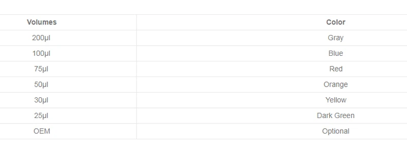 Спецификация:25ul 30ul 50ul 75ul 100ulКлючевые особенности• Эргономичный дизайн обеспечивает отличную работу• Умный корпус, идеально сочетается с реагентами IVD• Совместим с универсальными наконечниками 200 мкл• Различные объемы от 10 до 200ul, разные цвета для разных объемов, легко выбрать• Весь корпус с помощью одноразового формования, прочный в использовании