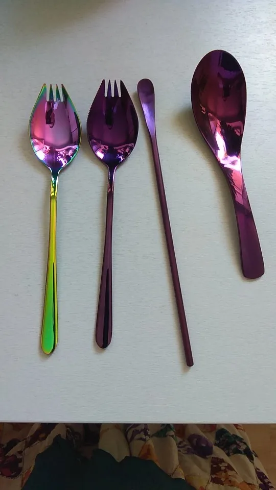 Материал: нержавеющая сталь 18/8Цвет: серебристый, черный, фиолетовый, золотой, синий, розовое золото, Радужный № 3, Радужный № 0Размер: S ------ 13 смM------22.5CMПрименимые случаи: дом/ресторан/вечерние/барУпаковка; 1 лот = 1 шт.