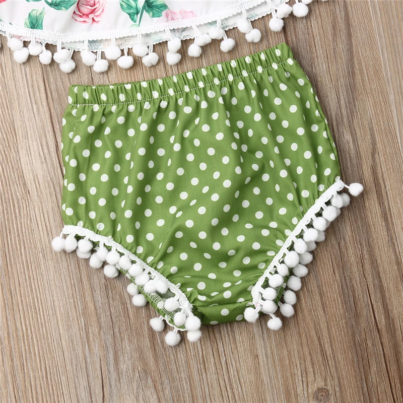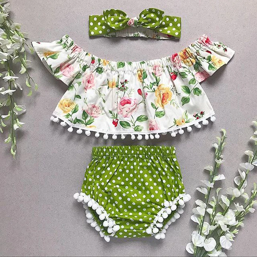 Комплект одежды для новорожденных девочек, футболка с цветочным принтом и открытыми плечами, короткий топ, повязка на голову, шорты в горошек с кисточками, комплект из 3 предметов