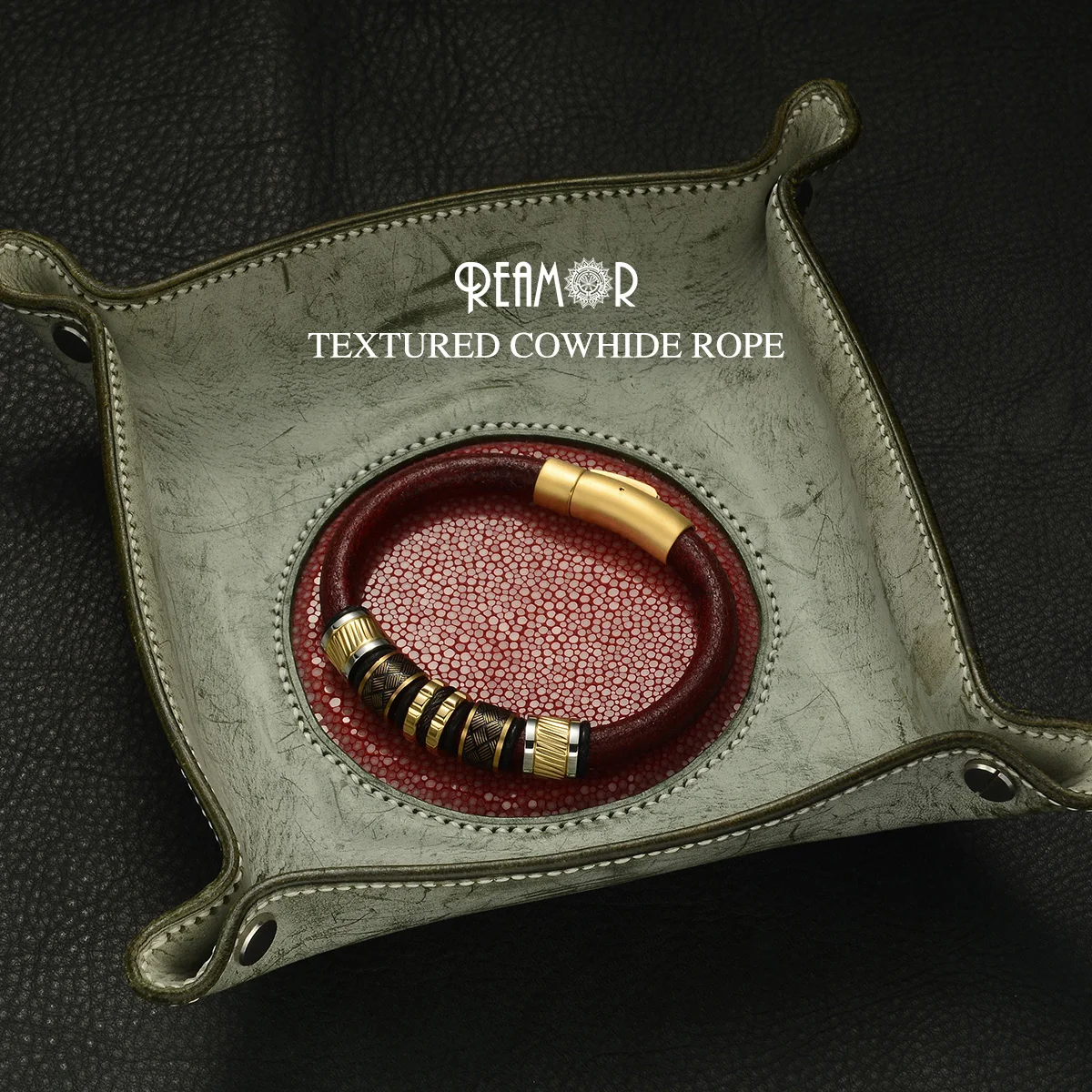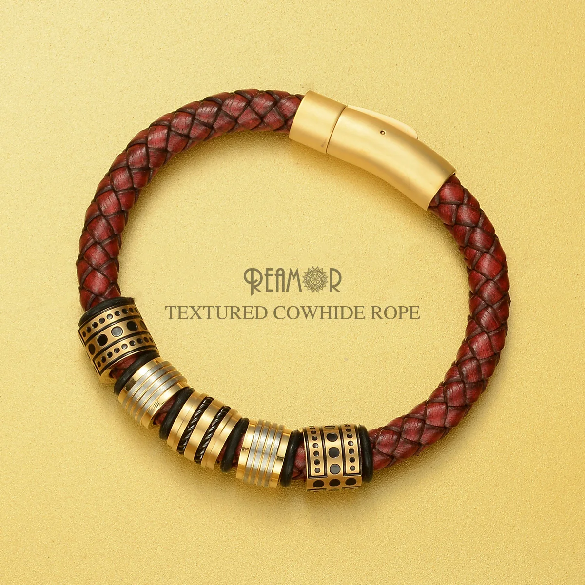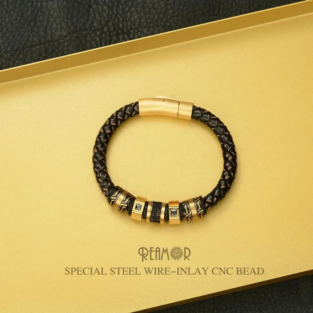 Мужской плетеный браслет из натуральной кожи REAMOR, роскошный браслет из нержавеющей стали с черными цирконами и золотыми бусинами, ювелирные изделия ручной работы