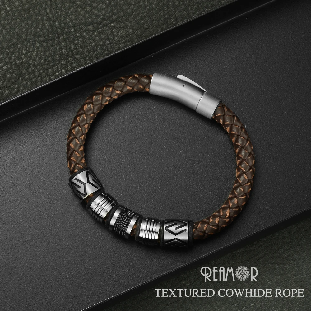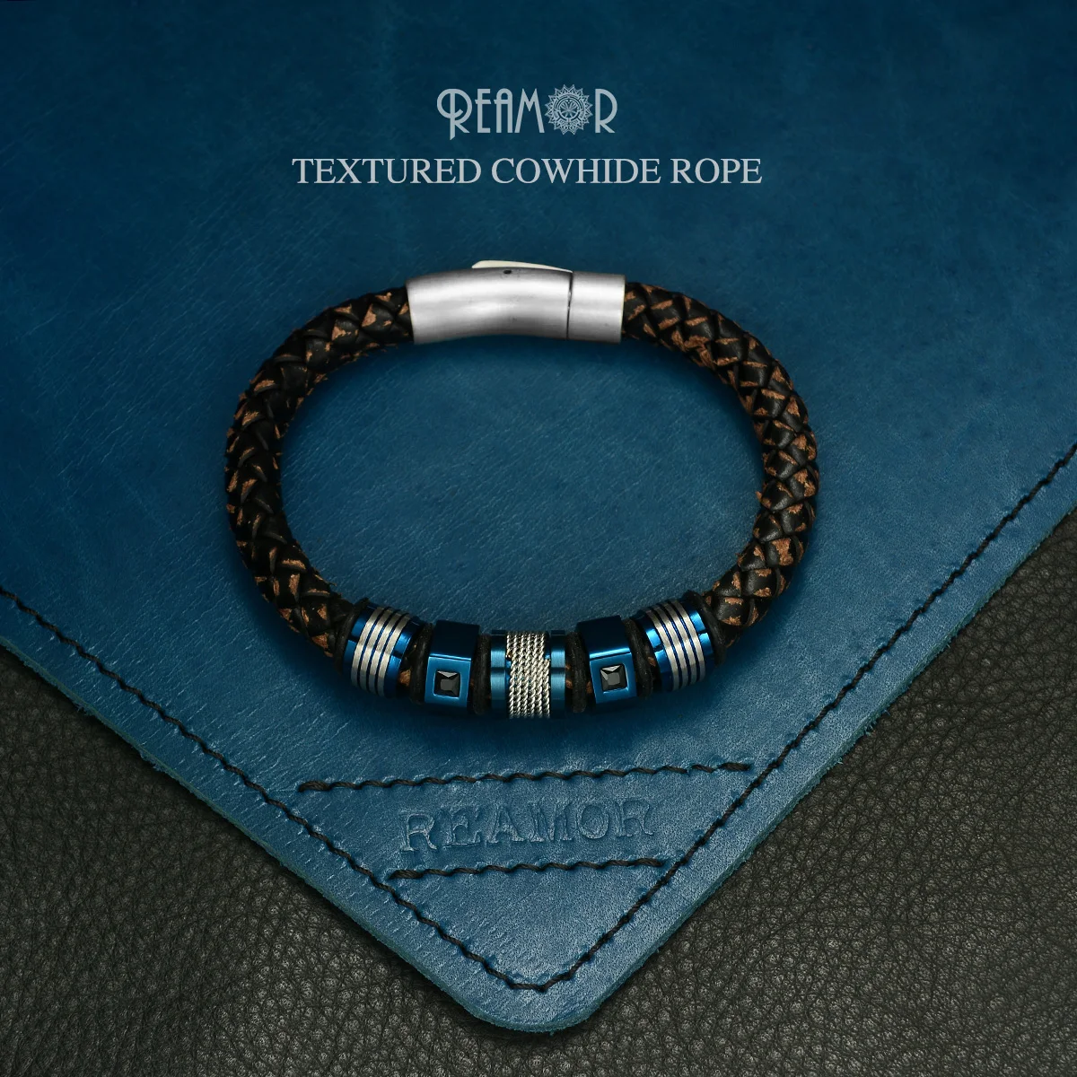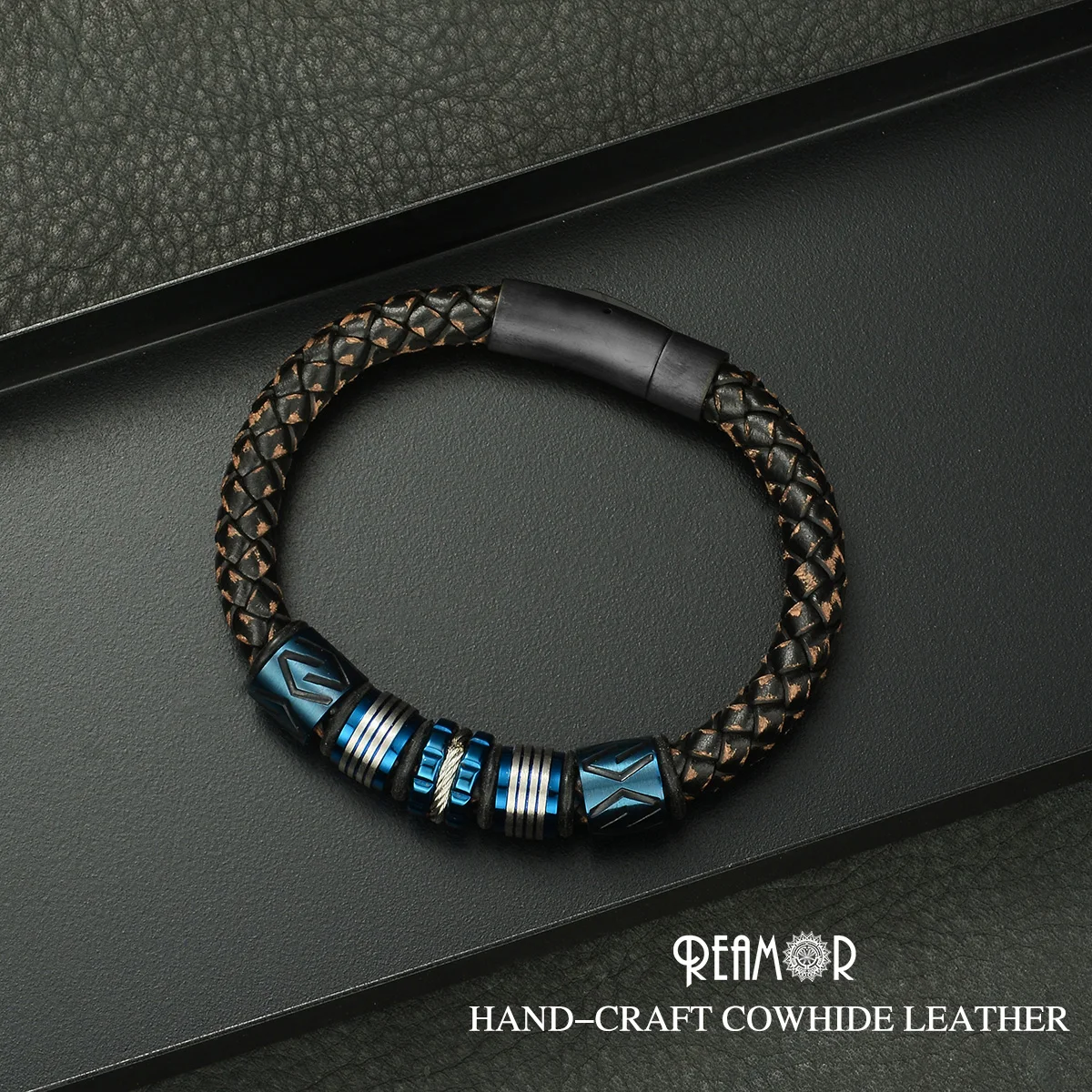 Мужской плетеный браслет из натуральной кожи REAMOR, роскошный браслет из нержавеющей стали с черными цирконами и золотыми бусинами, ювелирные изделия ручной работы