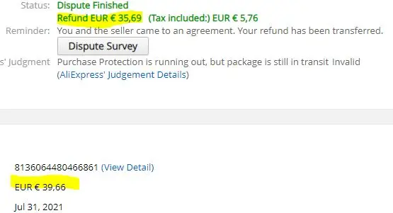 Это афера! Только после того, как я заплатил и продавец пометил товар готов к отправке, продавец сказал мне, что цвет сумки намного темнее, чем на фото. И они не могли вернуть мне деньги, поэтому они попросили меня подождать 10 дней, чтобы открыть спор. Теперь результат диспута выходит, я заплатил 39,66 евро, и они вернут мне только 35,69 евро! Я не получил сумку, и я должен заплатить 4 евро ни за что! Я не могу даже отклонить это решение, потому что спор закрыт. И продавец всегда очень долго реагирует даже в рабочее время.