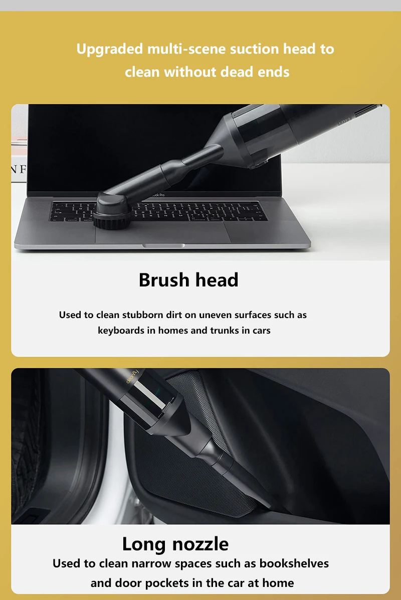 Модернизированная многофункциональная всасывающая головка для очистки без мертвых концов Головка щетки Используется для очистки упрямой грязи на неровных поверхностях, таких как клавиатуры в домах и стволов в автомобилях Длинная насадка Используется для очистки узких пространств, таких как книжные полки и дверные карманы в автомобиле дома Шланг + головка щетки Используется для очистки интерьера автомобиля, например, центральной консоли и задней полки Шланг + длинное сопло Используется для очистки узких мест, таких как дно столов, стульев и подушечек для ног в автомобиле