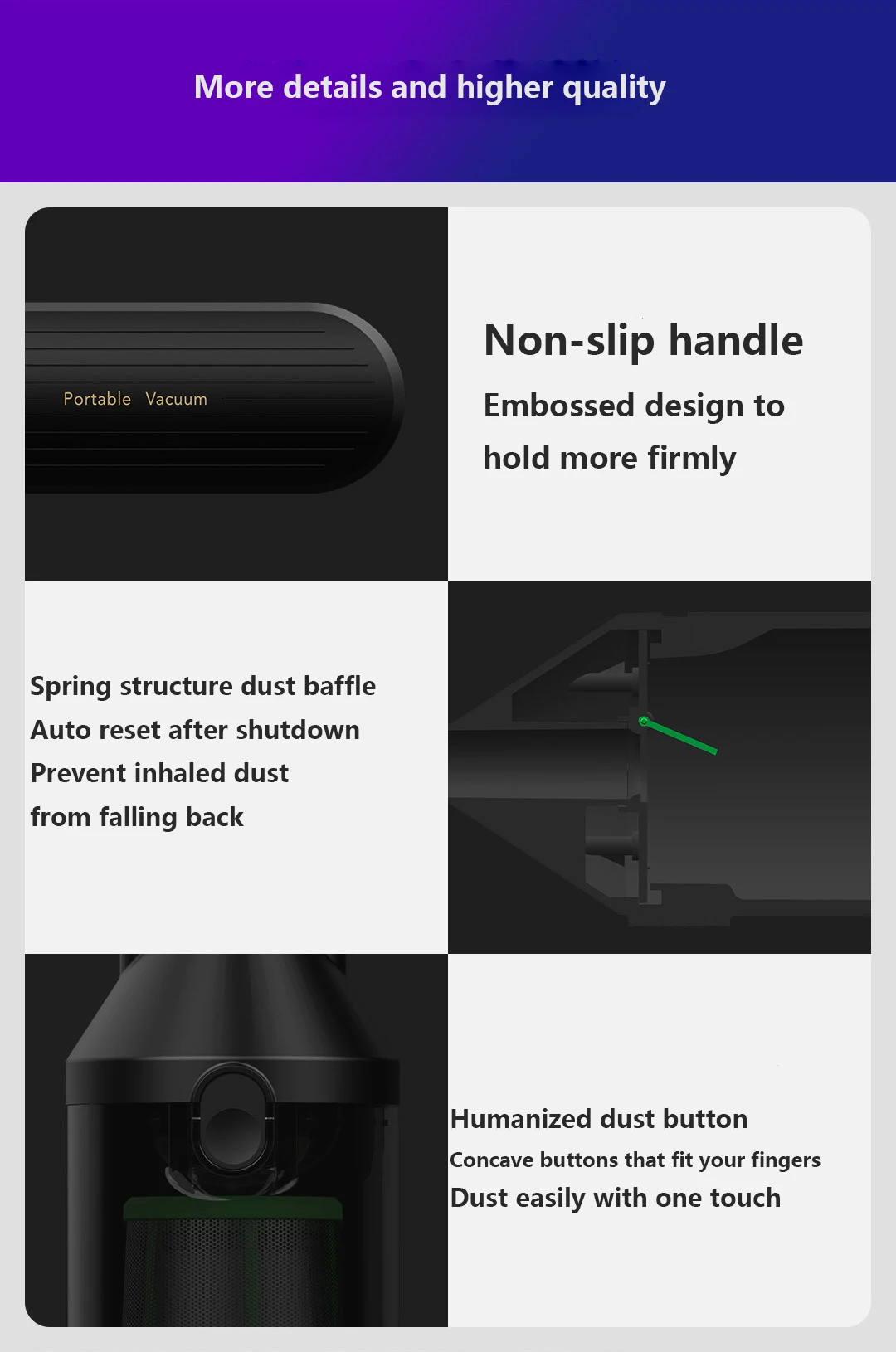 --- Нескользящий дизайн с тиснением на руль более прочно --- Пружинная структура пыли baffleAuto сброс после shutdowndeporter вдыхаемая пыль от падения обратно --- Вогнутые кнопки Humanized dust, которые легко сидят на ваших пальцах одним касанием