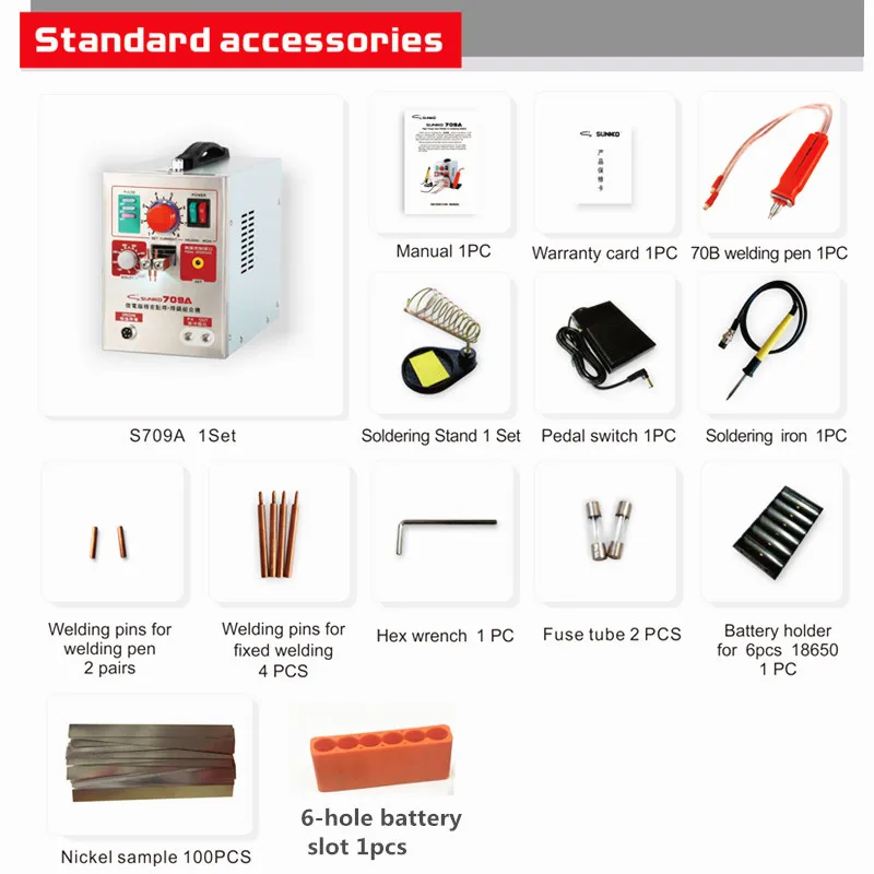 Деталь точечной сваркиПоставка Напряжение 220V / 50 HZ, переменный ток, 110 В/60 Гц (Выберите)Мощность 1,9 кВт (мгновенно)Ток 500 АЭлектрический выключатель утечки 60 A или более 60 AВремя двойного импульса 1 ~ 10 мс(Мгновенное время сварки) (регулируется, регулируя ручку сварочного тока)Время четырех импульсов 2 ~ 20 мс (регулируется)(Мгновенное время сварки)Время восьми импульсов 8 ~ 80 мс (регулируется)(Мгновенное время сварки)Диапазон сварочных штифтов 5 - 6 ммСварочное давление 300 - 500 гРегулируемое расстояние сваркиПодходит для сварки всех сплавов толщиной 0,03-0,3 мм дляЧистого никеля или никелированной стали диапазон составляет 0,08-0,2 мм.Часть паяльникаТемпература 150 °C ~ 450 °CМощность 50 ВтВыходное напряжение 20 В постоянного тока