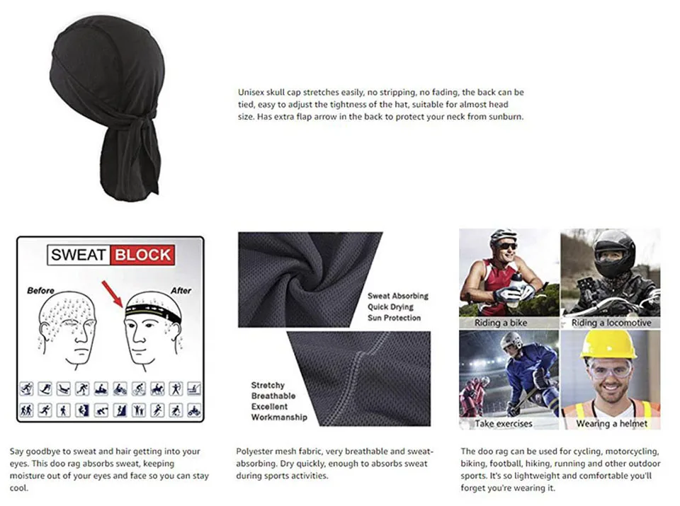 бандана соответствует описанию: материал легкий, дышащий. швы все аккуратные, обработаны. для лета хороший вариант. на мою голову 58 размера подошла.