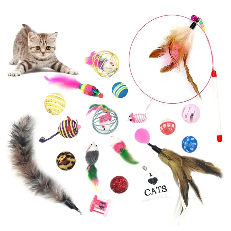 Набор игрушек для кошек, 20 шт., Интерактивная волшебная палочка, набор для кошек, забавная мышь, шарики для сизаля, наборы перьев для котенка, товары для домашних животных, набор игрушек