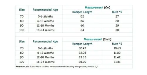 Размеры Рекомендуемый возраст Измерение (см) Длина комбинезона Бюст * 2 70 0-6 месяцев 52 27 80 6-12 месяцев 56 28 90 12-18 месяцев 60 29 100 18-24 месяцев 64 30 Размеры Рекомендуемый возраст Измерение (дюйм) Длина комбинезона Бюст * 2 70 0-6 месяцев 20,47 10,63 80 6-12 месяцев 22,05 11,02 90 12-18 месяцев 23,62 11,42 100 18-24 месяцев 25,20 11,81Разница в 2-3% в соответствии с измерениями вручную. Прежде чем купить эту товарную позицию, просим тщательно свериться с таблицей размеров. 1 дюйм = 2,54 см Обратите внимание что небольшая разница в цвете считается приемлемой. Это может быть связано с положением источника света и с настройками экрана.