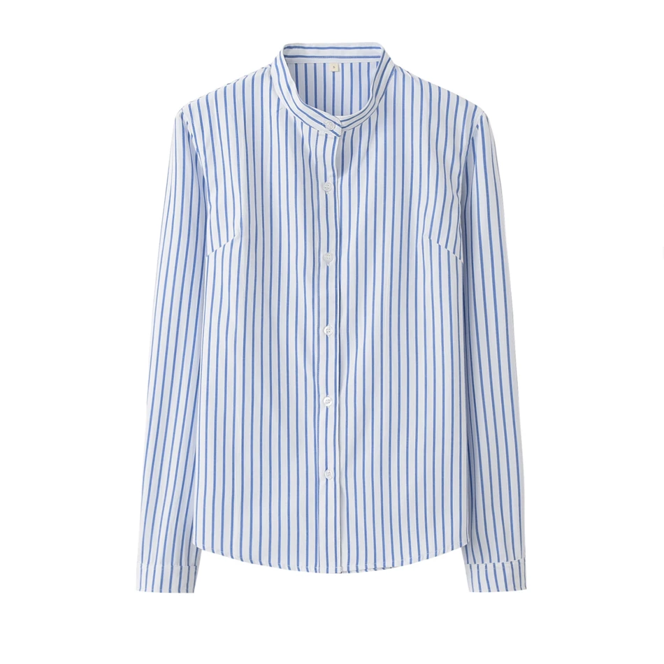 Женская блузка с длинным рукавом, Повседневная Простая рубашка в синюю и красную полоску, с воротником-стойкой, весна 2021, размера плюс