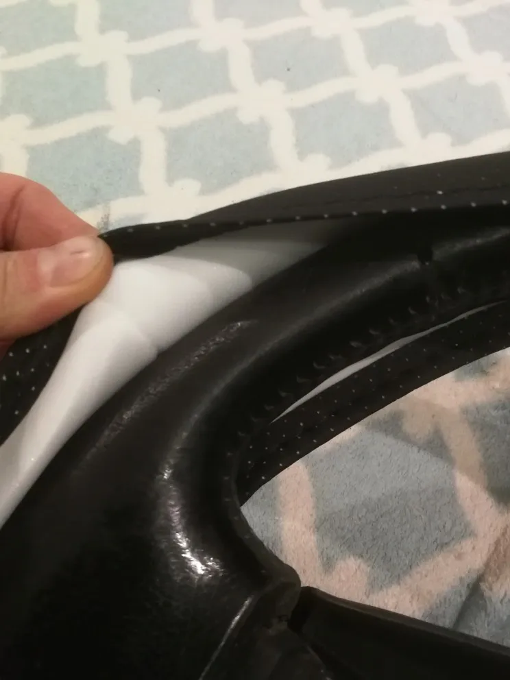 Não abraça o volante todo, deveria ter mais um centímetro para dar a volta ao volante, assim ao apertar a linha Fica uma folga. E depois a linha não chega para tudo. Não ficou o trabalho bem feito porque o material não me pareceu muito bem.