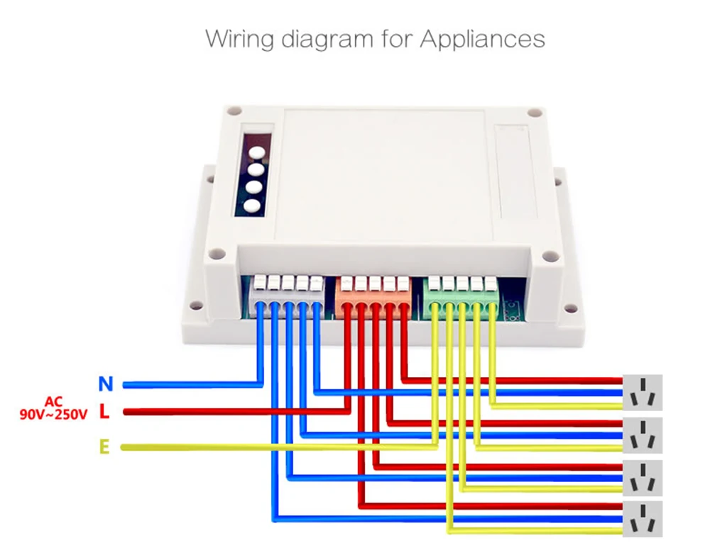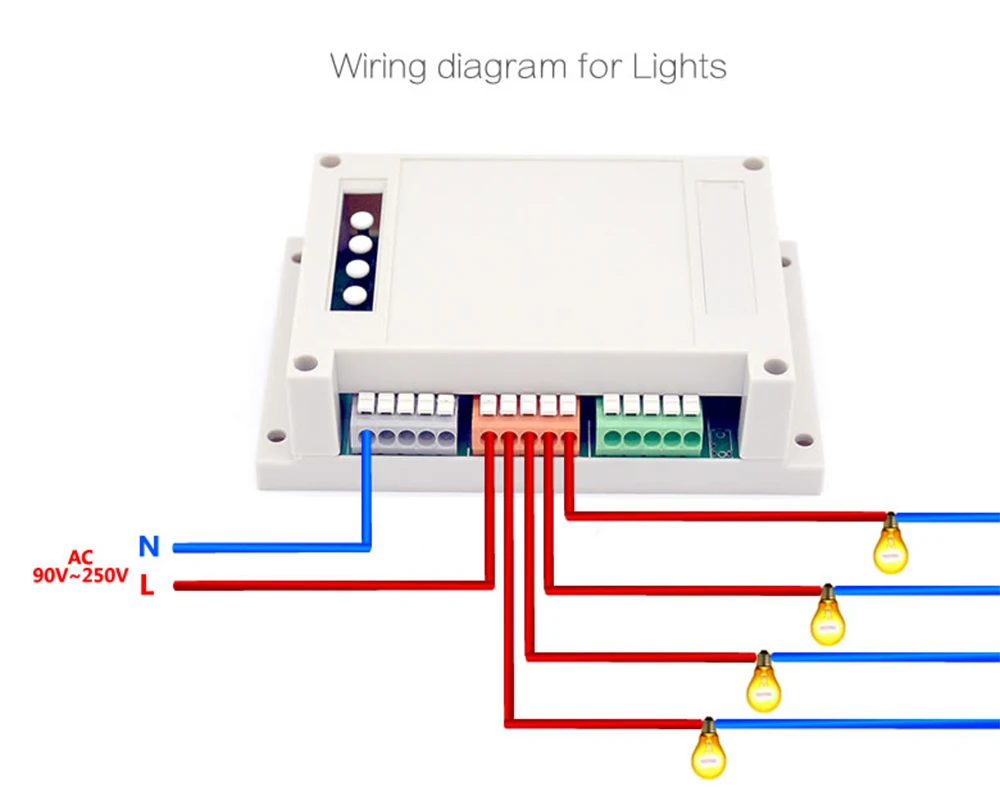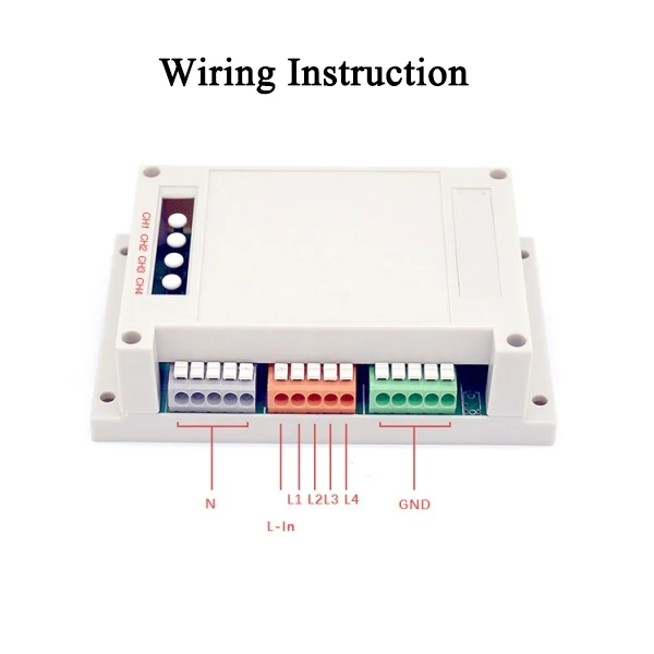 L-вход: вход под напряжением Кнопка CH1 также является кнопкой сопряжения Wi-Fi. Нажмите и удерживайте, пока светодиод не начнет мигать в состояние сопряжения. L1,L2,L3,L4 порты соответственно подключаются к каналу 1, каналу 2, каналу 3, каналу 4. Вы можете случайным образом подключиться к любому из пяти портов N и 5 портов GND для вашего устройства.