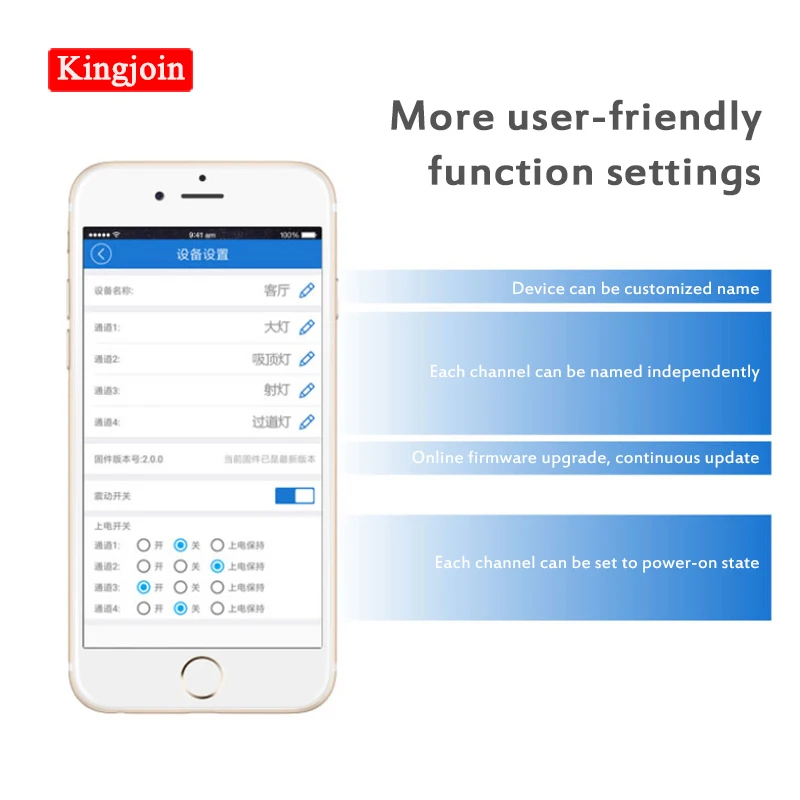 Поддержка независимого включения/выключения 4 бытовых приборов Поддержка управления бытовой техникой с помощью местных кнопок переключения или приложения Поддержка отслеживания состояния устройства и своевременного дистанционного управления через приложение Поддержка времени обратного отсчета и расписания Поддержка устройства общего доступа одной кнопкой для других пользователей