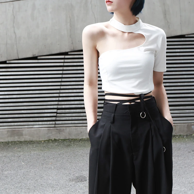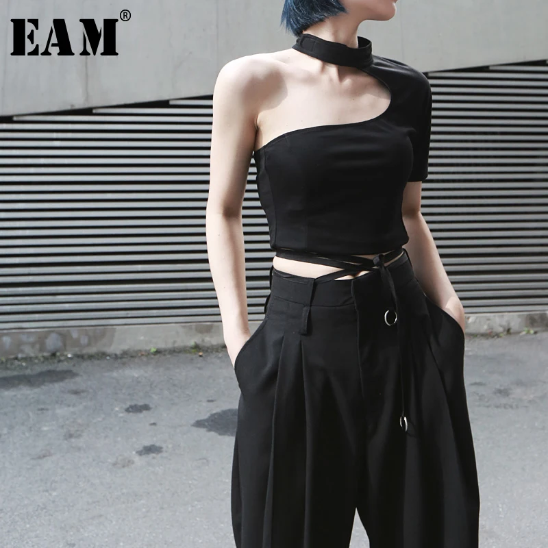 EAM 2022 Новинка Весна Лето круглый вырез короткий рукав открытая спина необычная короткая футболка женская мода JX391