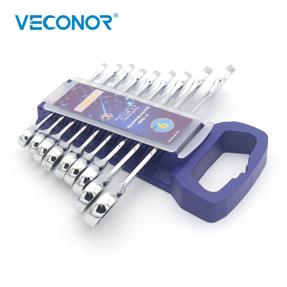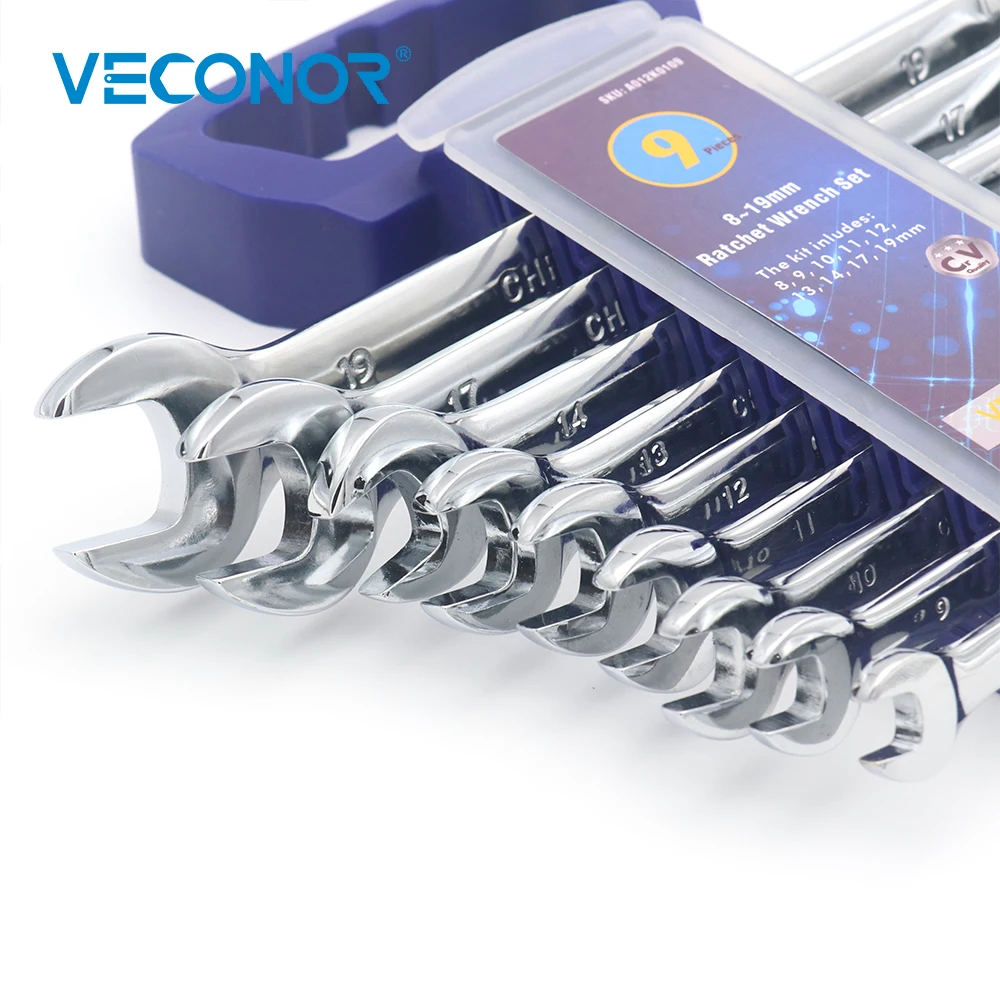 Рычажный ключ храпового механизма на каблуке (9 шт. гаечный ключ инструменты 72T Ratcheting головка зеркальная полировка Инструменты для ремонта 8-19 мм комплект гаечных ключей с Стеллаж для выставки товаров