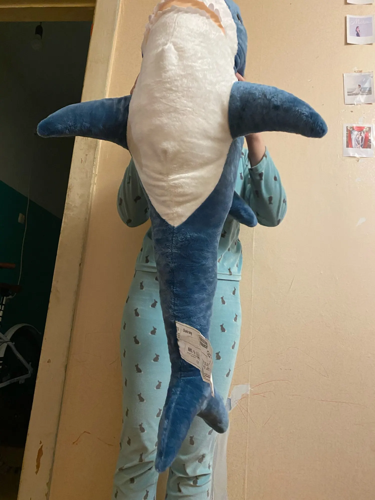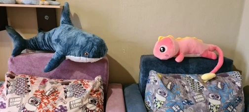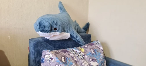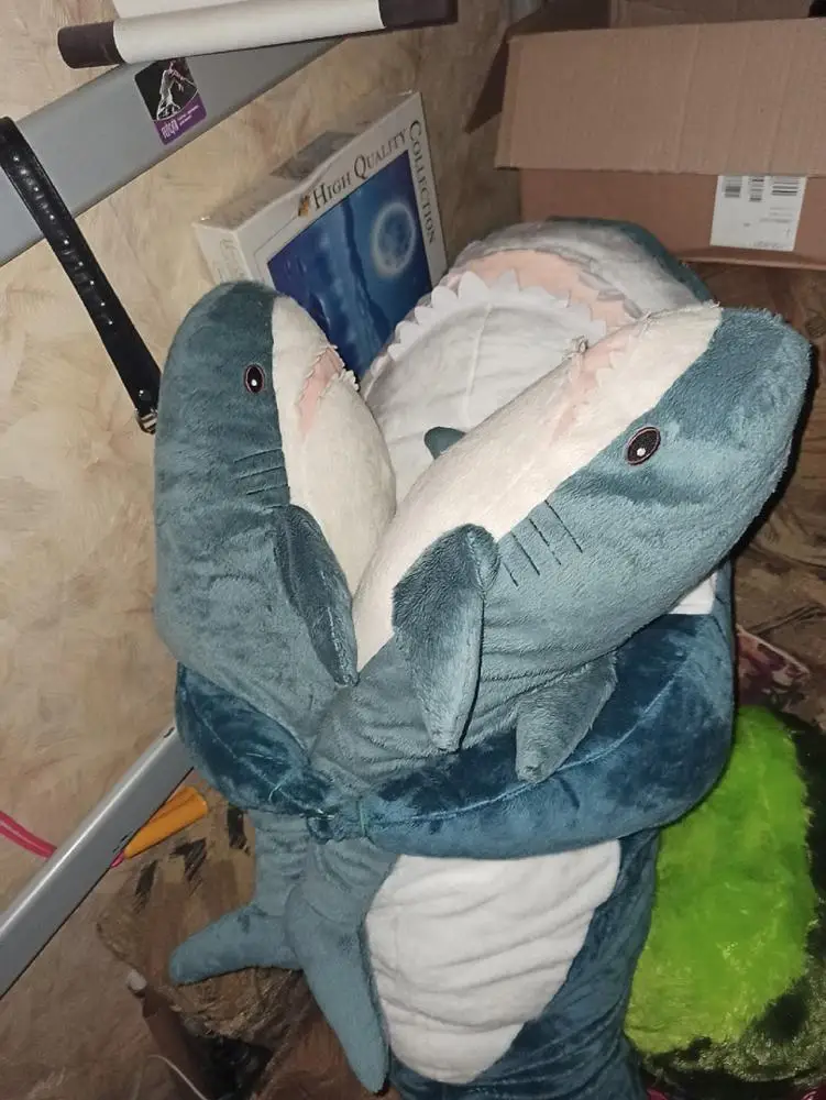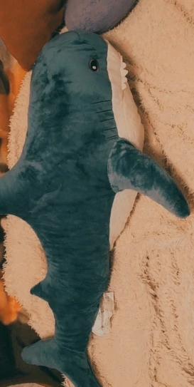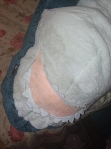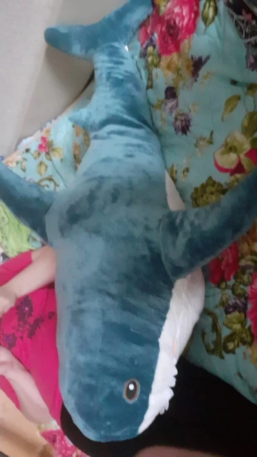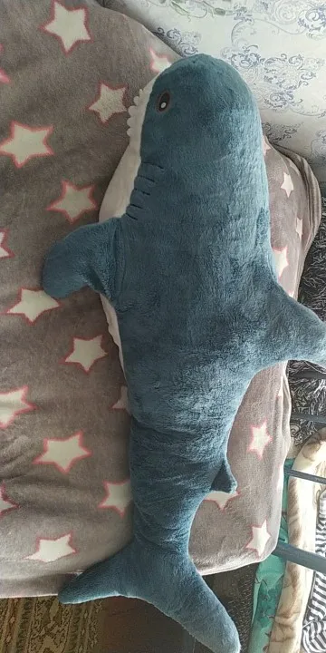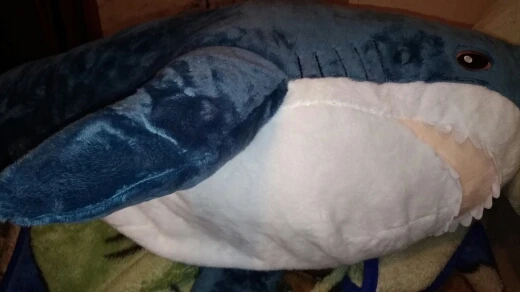 акула прикольная. ждали к новому году, но дед мороз только к рождеству успел.. набита не плотно, как игрушка, а полегче, как раз чтобы удобно было спать в обнимку.