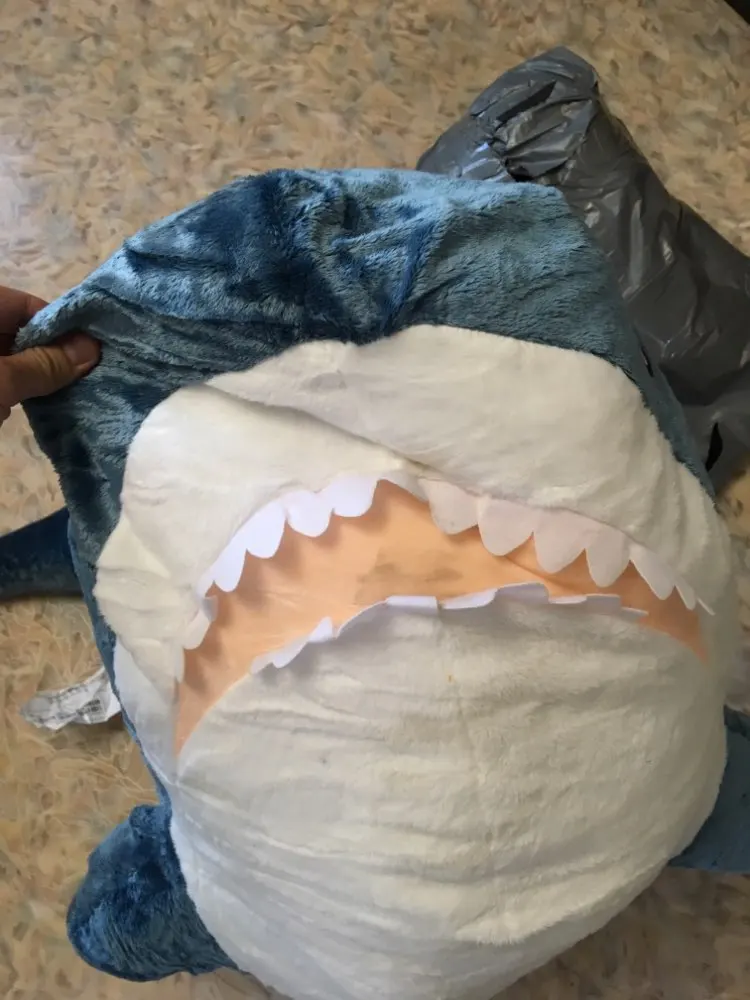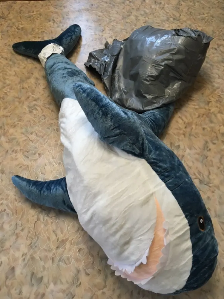 Акула классная, но по фотографиям на странице я ожидал что набивки будет побольше, но то что есть тоже хорошо. Единственное что огорчило, это то что данная посылка была собрана с двумя другими, была допущена ошибка в паспортных данных, и посылка мариновалась на таможне почти 2 месяца.