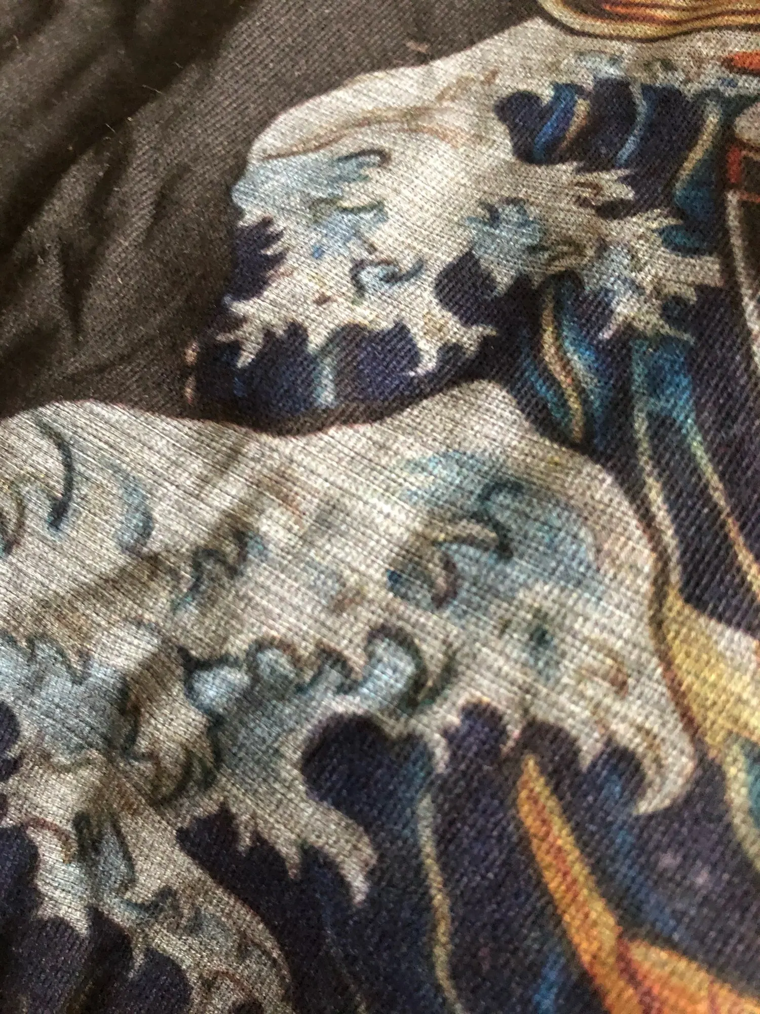 Ткань очень приятная, принт хороший, но медленно выцветает со строками. Размер один в один.