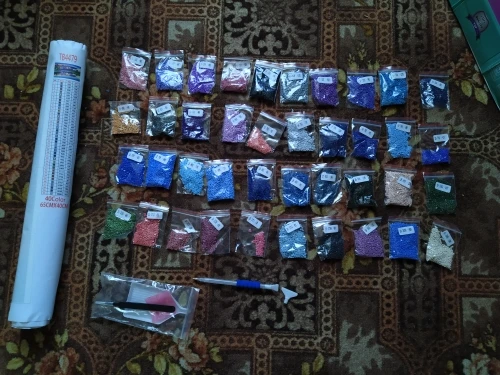 Картина очень красивая, смотана в рулон. Не помята, стразы по цветам совпадают. Единственное кажется что будет мало стразов, но пока не сложу картину не пойму. А так все хорошо. Рекомендую.