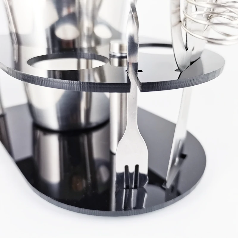 1 x шейкер для коктейлей, 1 x барный пестик, 1 х фильтр, 1x15/30 мл мерный стаканчик, 1 x барная ложка, 1 х комплект из нержавеющей стали Коктейль по рецепту, 1 x акриловая Винная стойка.