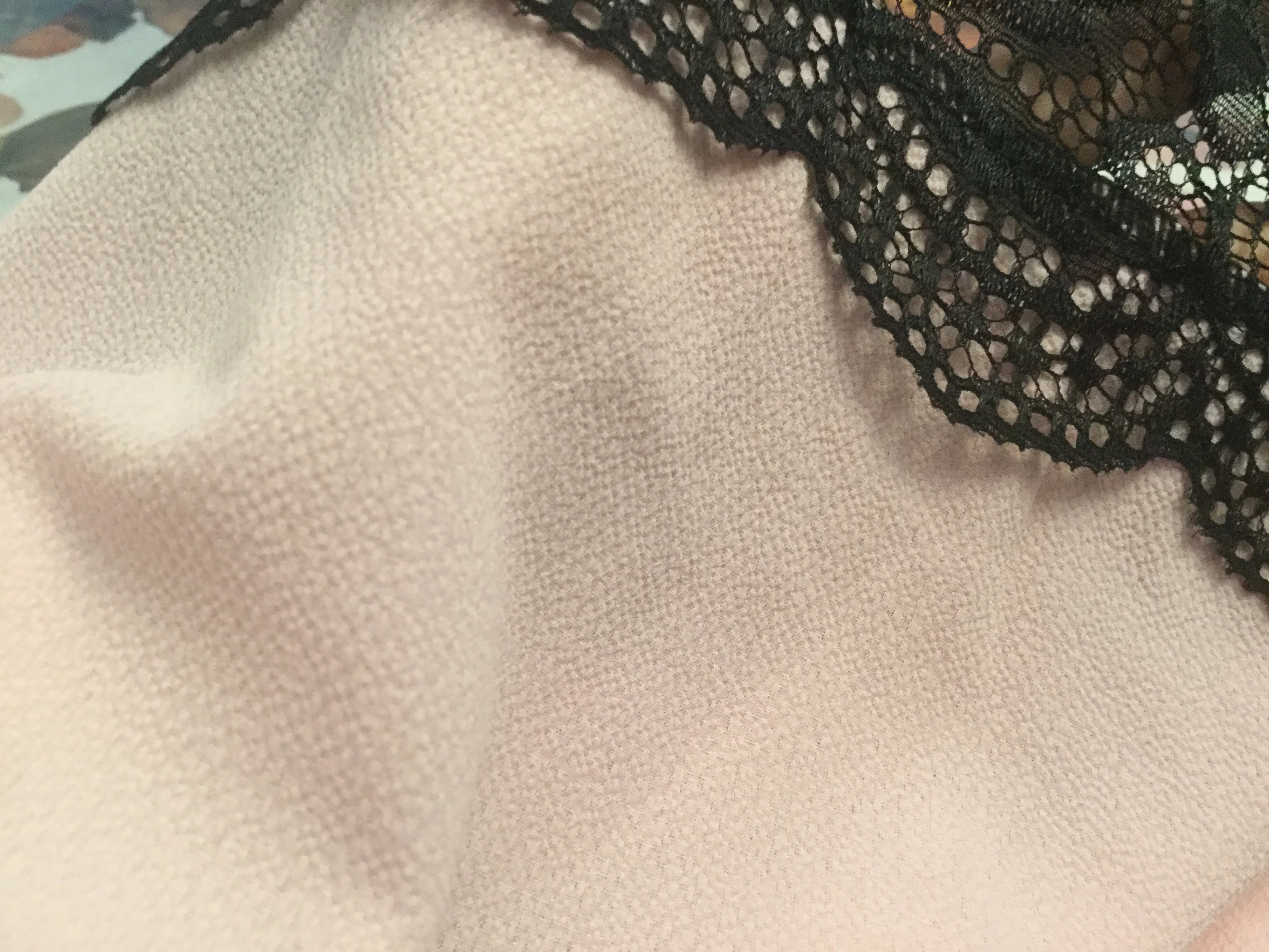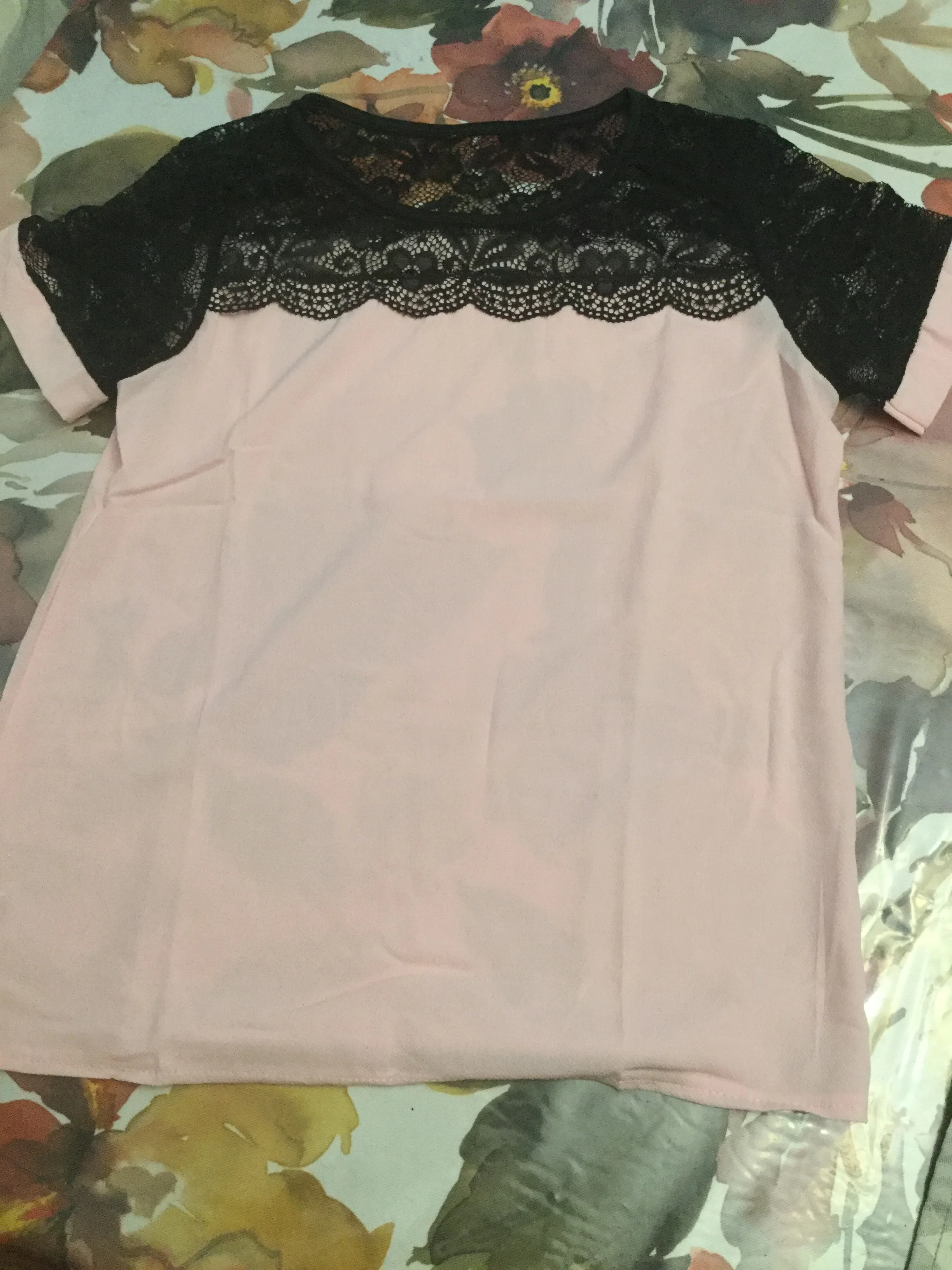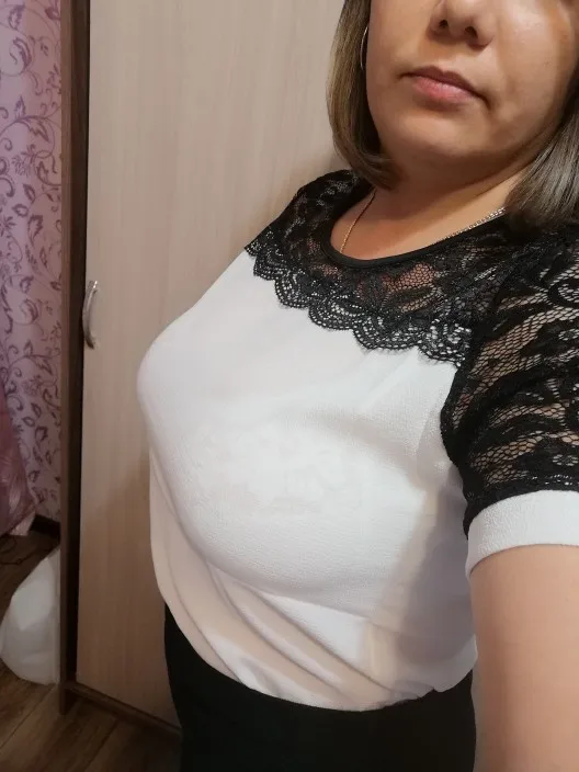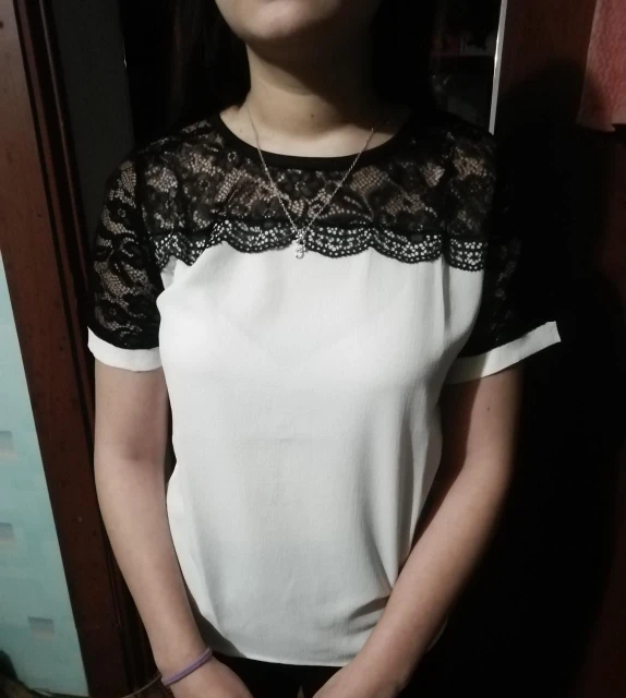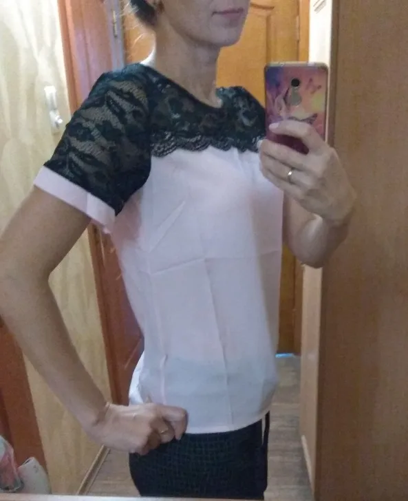 Заказ пришёл быстро. Трек отслеживался. Качество соответствует. Нитки не торчат, швы ровные. Кружево тянется, остальной материал нет. Немного просвечивает. Но для блузки вполне нормально.