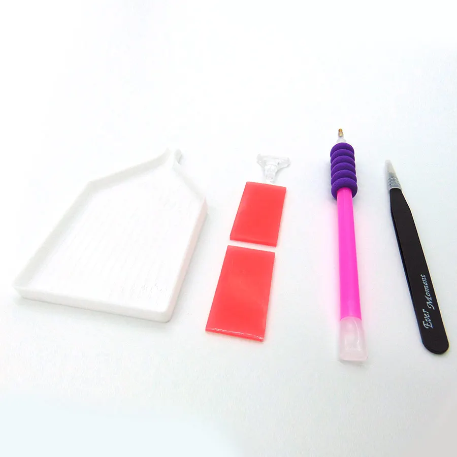 Инструменты в том числе: ручка (различные точки ручки для приклеивания 1, 3 или 6 бриллиантов), алмазная пластина, клей и пинцет