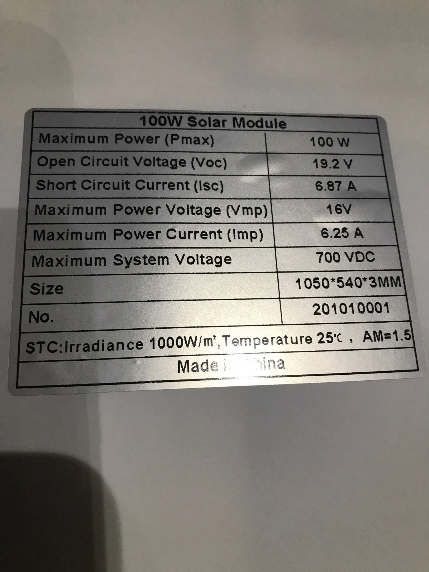 he recibido el panel. falta montarlo. este es de 100 w y anteriormente compre uno de 120 , aunque me enviaron uno de 100 . tras montarlo dire como va. pero el actual carga poco la bateria