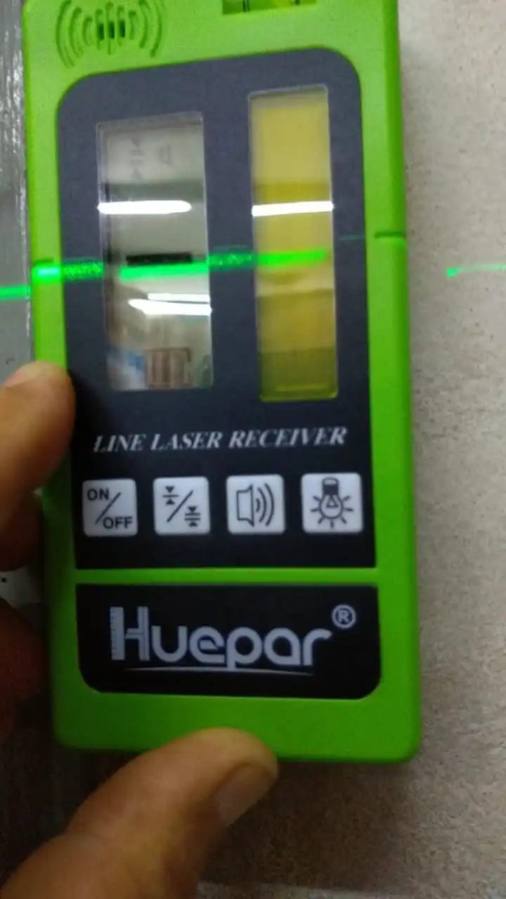 Уровень Box-1G составляет 2 метра от приемника, я предупреждаю, что приемное оборудование неточно. На фото показано, что маркировка приемника находится выше линии лазерного уровня, и все же приемник непрерывно подаёт звуковой сигнал, как если бы уровень был таким же. К сожалению.