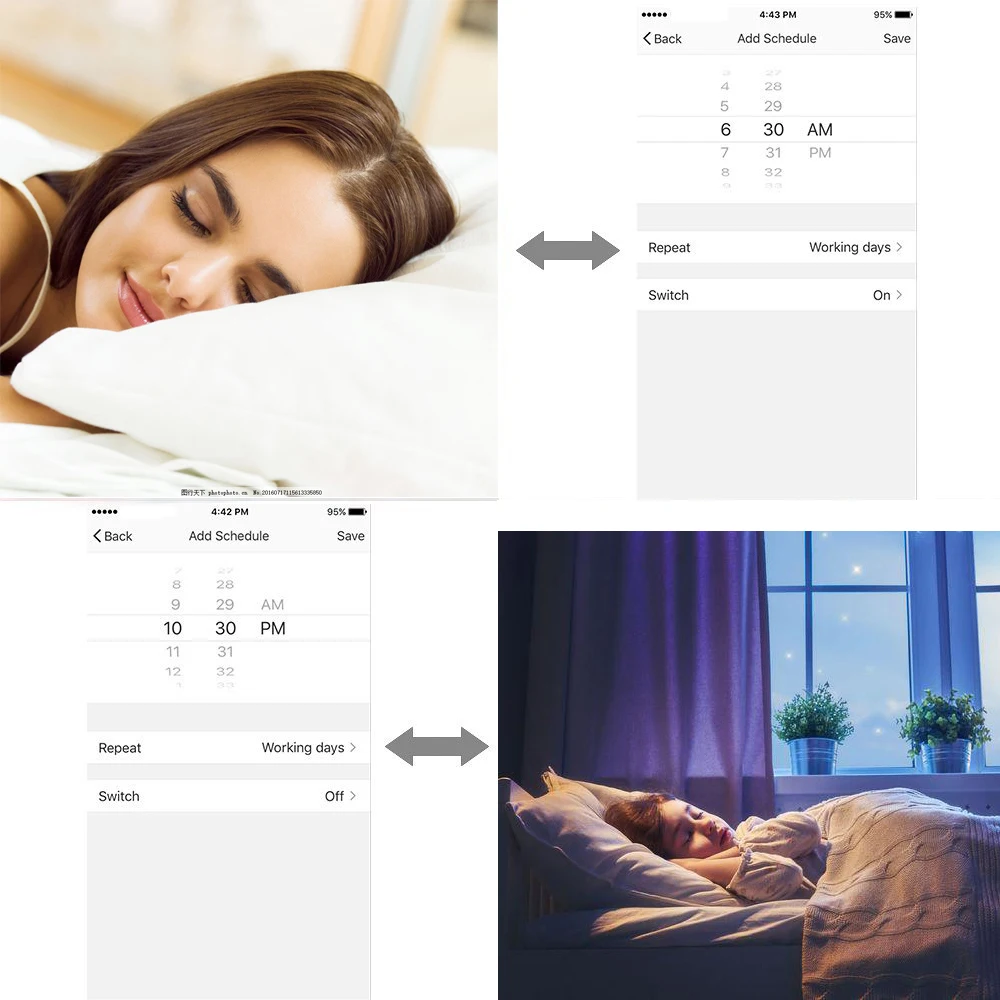 Там просто скачать бесплатное приложение: Smart Life или Tuya Smart. Вы можете установить расписание для лампы и настроить ваш светильник. Например, можно установить свет для включения или выключения в установленное время. И управлять этими умными лампами через свой голос с Amazon Alexa, Google Assistant, Siri и IFTTT. Просто дайте команду включить/выключить или затемнить/осветить лампу.
