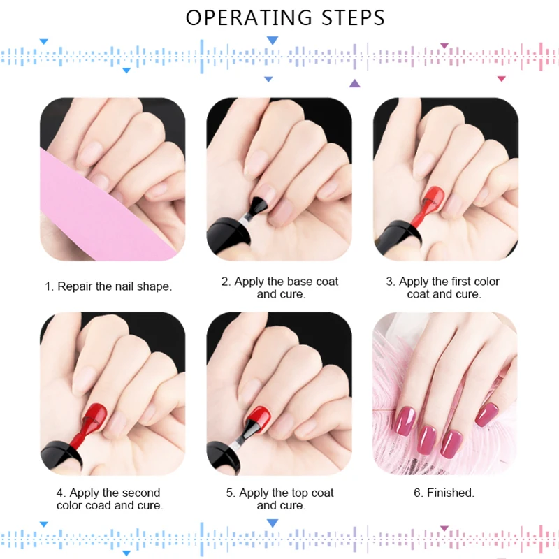 * Высокая технология и высокое качество. * Срок службы более 3 недель * Здоровые, экологические, дружественные, не используются ядовитые, резкие химические материалы. * Очень прост в эксплуатации. Пожалуйста, прочтите: УФ-гель для ногтей-это сочетание лака и УФ-геля. Продукты являются натуральными, без запаха и стимуляции. Нет ЛОС (летучие, органические, соединения), Нет формальдегида, Нет ртути или свинца. Профессиональный использование: 1. Очистите ногти, затем обрежьте поверхность ногтей как обычный процесс маникюра. 2. Полностью встряхните лак, он может сделать польский цвет сбалансированным. (ВАЖНО) 3. Нанесите тонкий слой базового покрытия и закрепите под лампой для ногтей (УФ 36 Вт/светодиодный 9 Вт или выше) в течение 2 минут 4. Нанесите тонкий слой 1-го цвета и закрепите под лампой для ногтей в течение 2 минут 5. Нанесите тонкий слой 2-го цвета и закрепите под лампой для ногтей в течение 2 минут 6. Не протирайте верхнее покрытие и Не сушите под лампой для ногтей в течение 2 минут Как удалить УФ-гель для ногтей: • Замочите ногти в стеклянной миске, заполненной небольшим количеством чистого ацетона, или оберните каждый ноготь в ватную подкладку, пропитанную чистым ацетоном, в течение 5-10 минут • Продукт начнет становиться мягким, и вы можете аккуратно отпилить его или сдвинуть с помощью небольшой деревянной палочки.