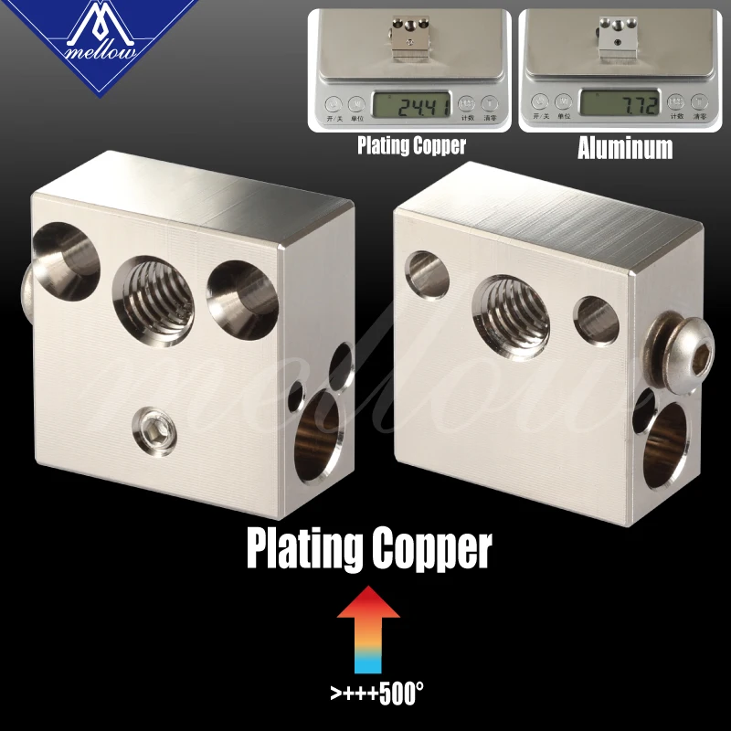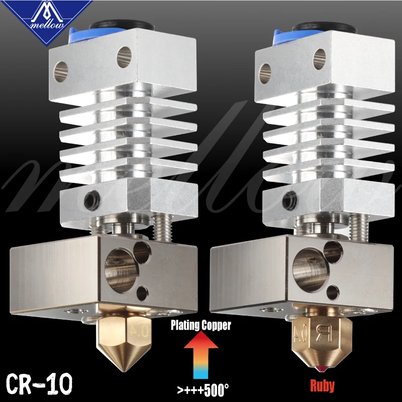 Покрытая медь-это наш новый нагревательный блок, изготовленный из высококачественной меди. Мы также добавили слой твердого, гладкого никелевого покрытия, который обеспечивает фантастический баланс стоимости и износостойкости. Этот медный сплав очень устойчив к температурам и не начнет смягчать или отжигать до более 500 °C, что делает его идеальным для высокотемпературной 3d-печати, с которой другие нагревательные блоки не могут справиться. Медь имеет более 3х теплопроводность латуни, и медный сплав, который мы используем, был закален и обработан, чтобы уменьшить окисление, которое происходит в меди при высоких температурах. Более высокая теплопроводность также немного увеличит время нагрева и может обеспечить более жесткий контроль температуры. Это капля в все металлические конверсионные наборы для CR-10 принтеров. Для установки принтера требуется абсолютно нулевая модификация. Наш уникальный охлаждающий блок устраняет необходимость в тепловой трубке. Не имея отдельной тепловой трубки внутри блока охлаждения, это позволяет быстрее рассеивать тепло. Тепловой разрыв сделан из титанового сплава, чтобы обеспечить отличную тепловую изоляцию между нагревателем и охлаждающим блоком. Титан является чрезвычайно сильным материалом и обеспечивает почти 3х меньшую теплопроводность, чем нержавеющая сталь, создавая более определенную мелтзону.
