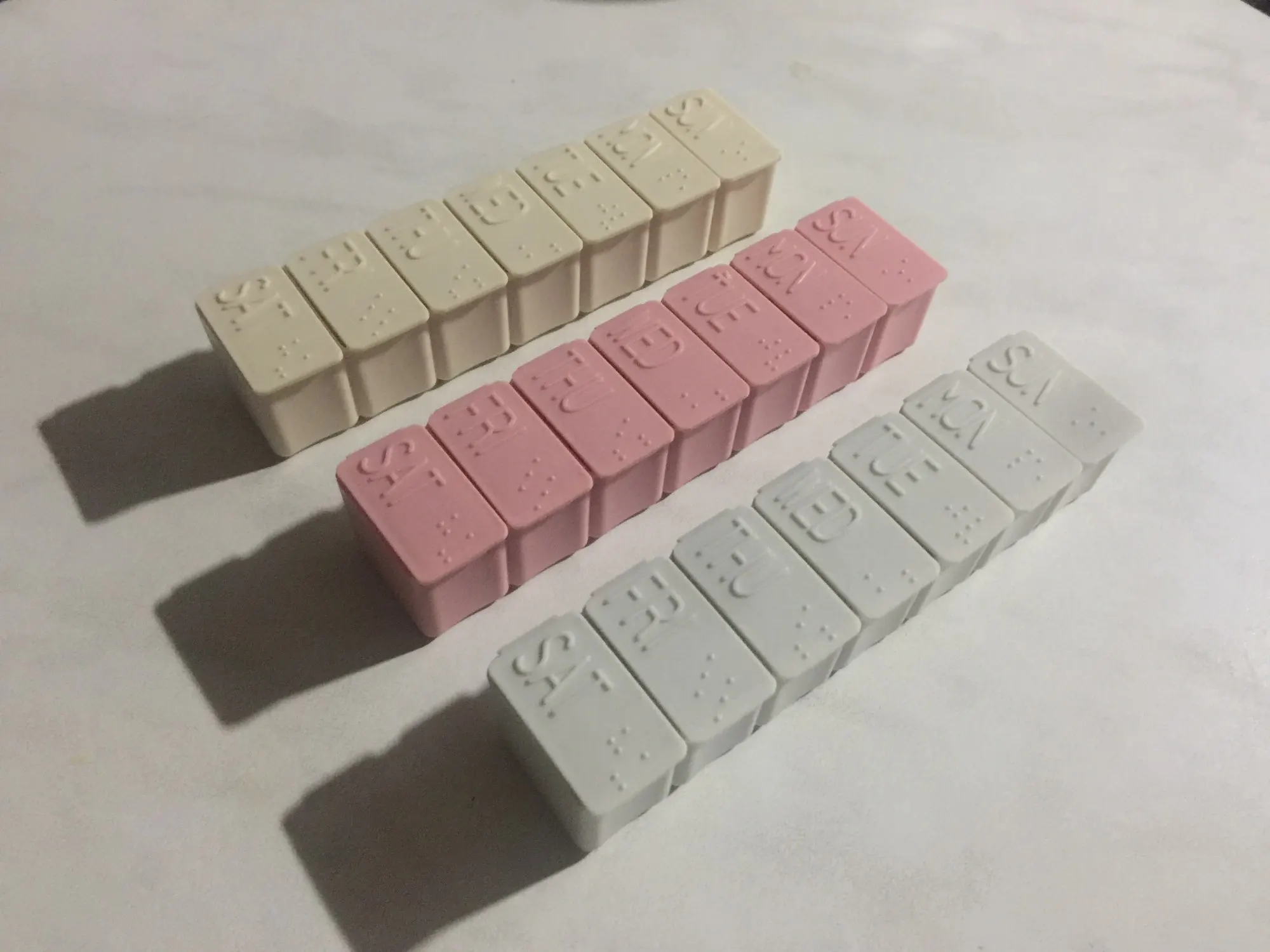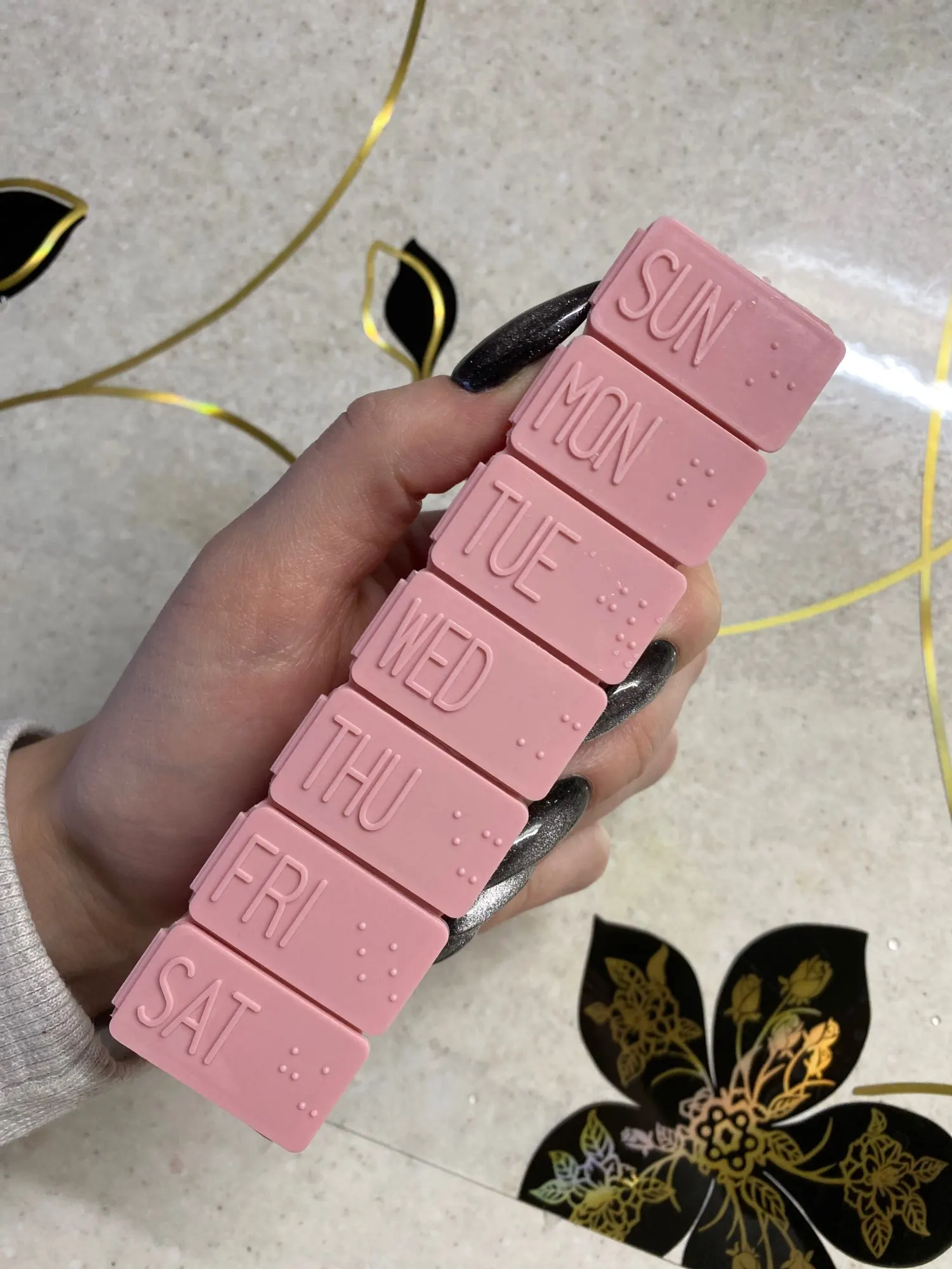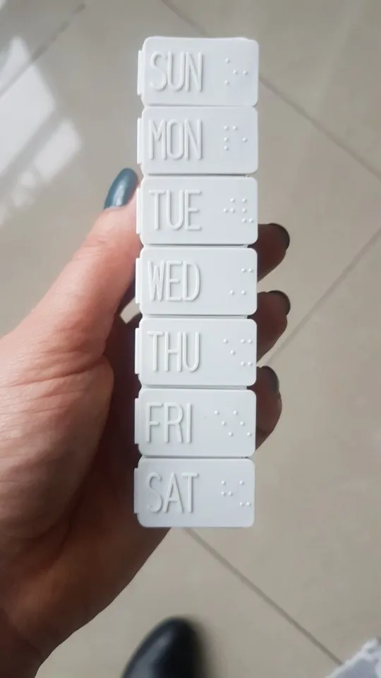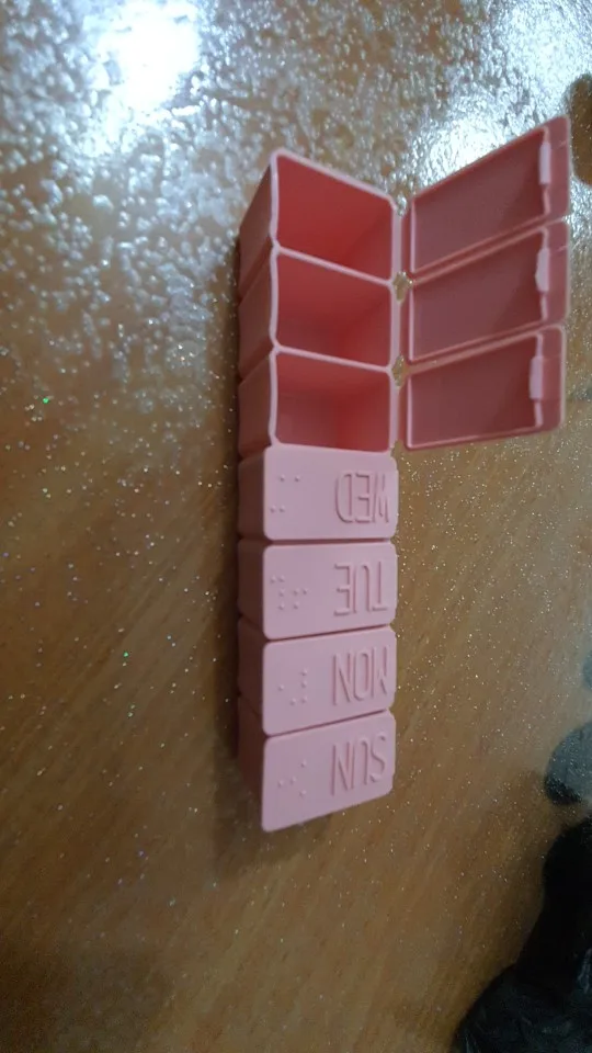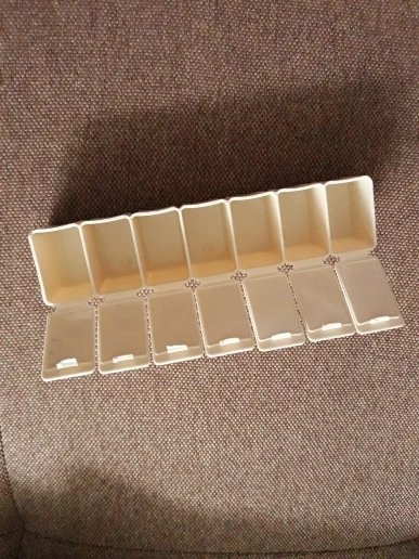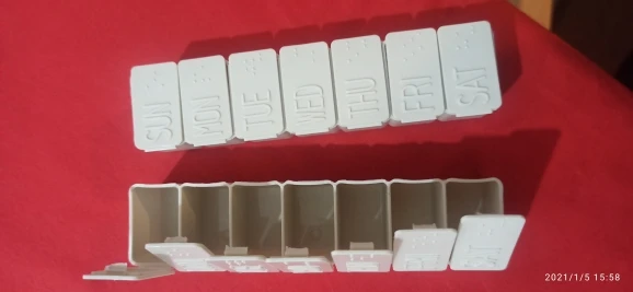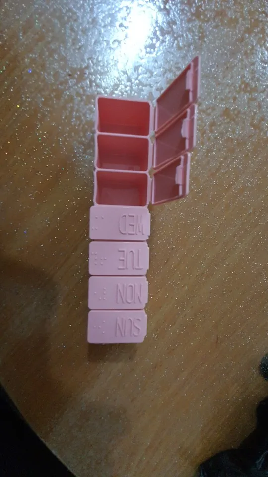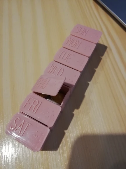 Неплохая таблетница за свою цену, соответствует описанию продавца. Сделана из приятного на ощупь пластика без запаха и дефектов. Защёлки не жёсткие, но держат хорошо. Длинные капсулы помещаются без проблем (2-3 в ячейку). Единственное, что смутило - типа шрифт Брайля на крышке, похоже, он не несёт смысловой нагрузки.