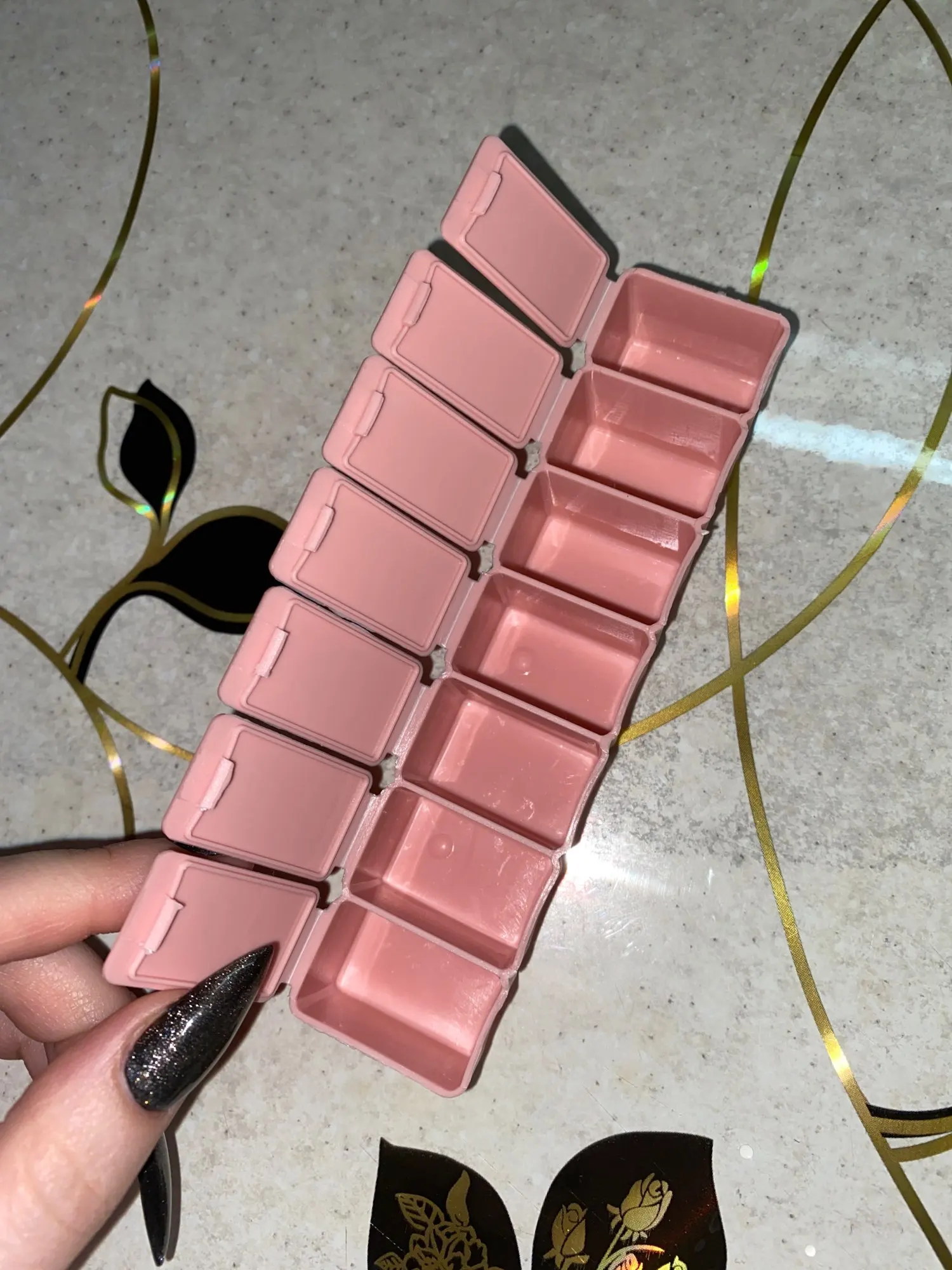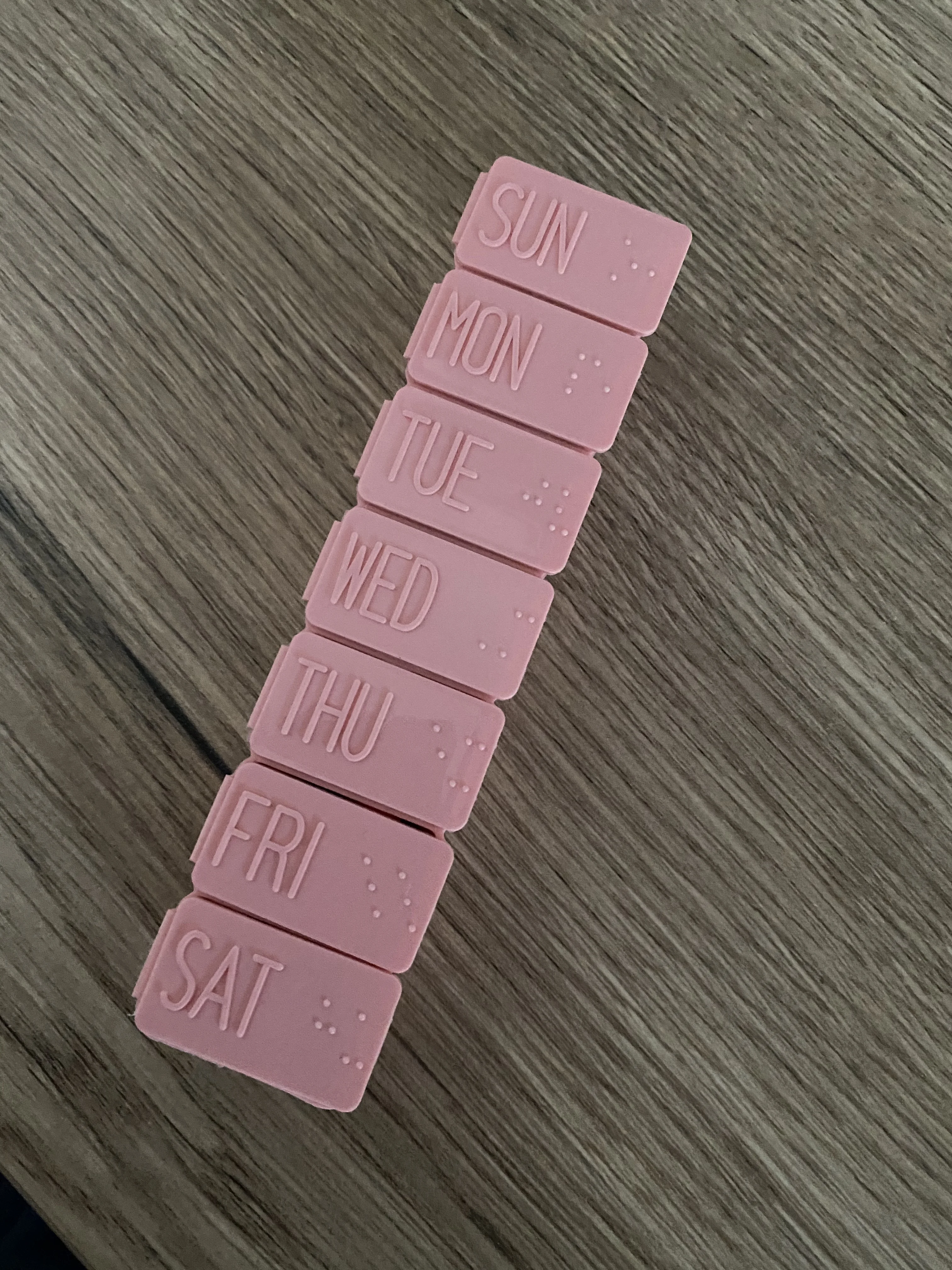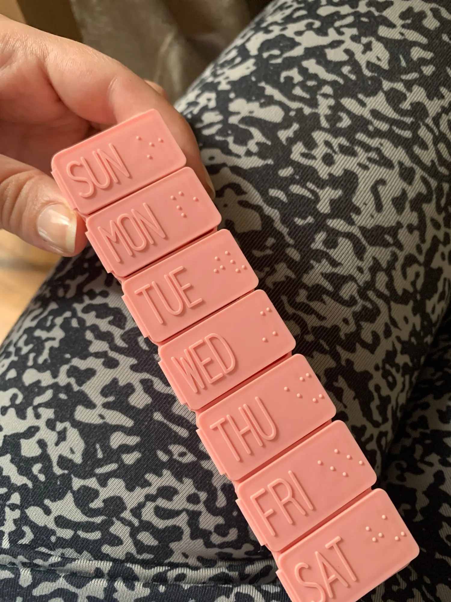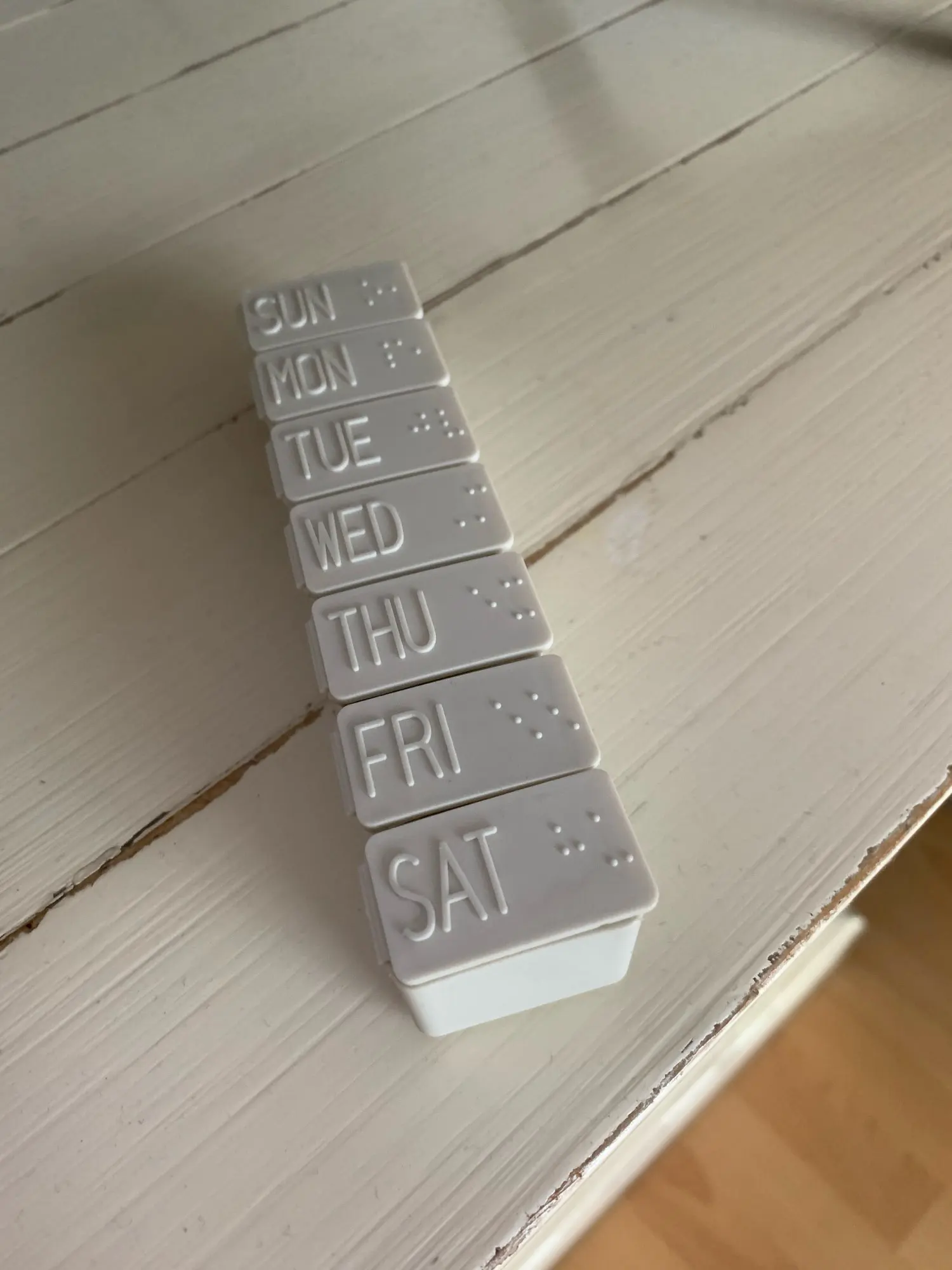Неплохая таблетница за свою цену, соответствует описанию продавца. Сделана из приятного на ощупь пластика без запаха и дефектов. Защёлки не жёсткие, но держат хорошо. Длинные капсулы помещаются без проблем (2-3 в ячейку). Единственное, что смутило - типа шрифт Брайля на крышке, похоже, он не несёт смысловой нагрузки.