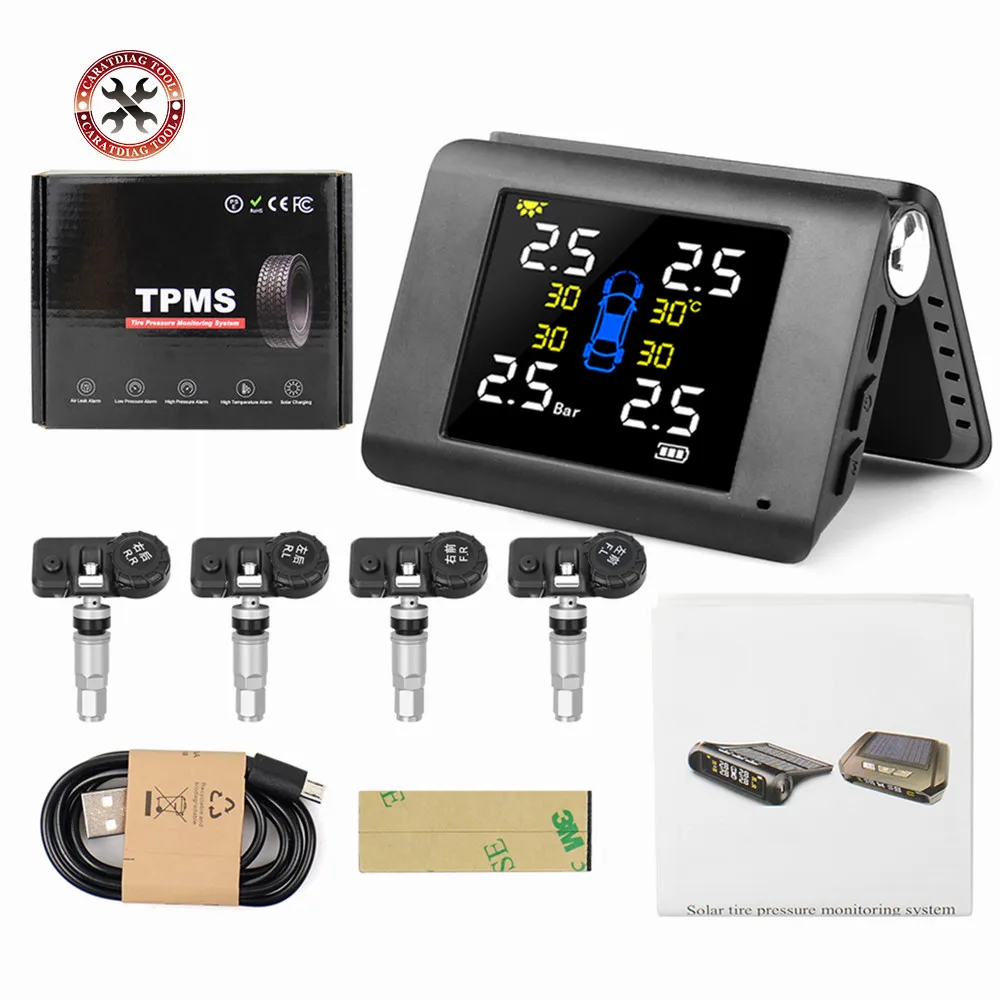 Состав солнечной TPMS такой же, как у обычных TPMS (система контроля давления в шинах), которая состоит из солнечного TFT экрана, принимающего дисплей и четырех датчиков давления/излучателей. В качестве мощной панели генерации энергии долгий срок службы, чтобы обеспечить в любое время зарядку, так что прием монитора питания более надежный и долговечный; даже в условиях отсутствия солнечного света в темной среде, дождя и снега погодные условия по-прежнему могут служить более 15 дней, есть интерфейс USB зарядного устройства, Устройство с двойной зарядной системой обеспечивает постоянный срок службы устройства.
