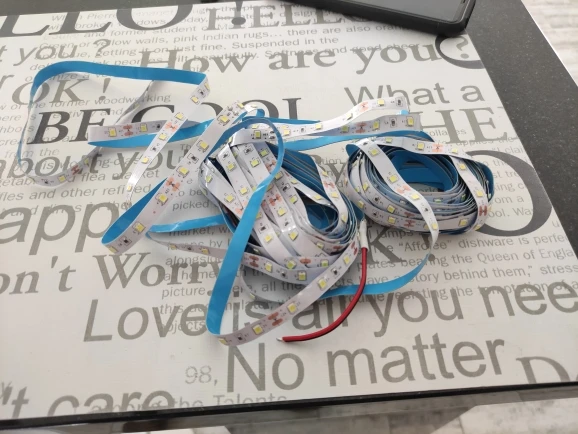 Хорошая лента, цвет белый. Завелась от 9 вольт, 12 под рукой нет. Думал диоды будут почаще. Как клеется не знаю, ещё не клеел. Доставка быстрая через пятерочку.
