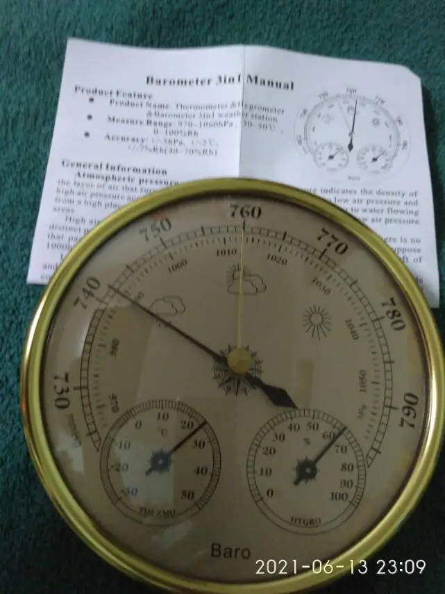 Описанию соответствует. Заказывала 2 шт, у одного немного потёртое стекло. Показания двух приборов отличаются на одно деление. Как домашний прибор свою функцию выполняет, учитывая быстро меняющуюся погоду и часто врущие службы прогнозирования погоды. С продавцом не общалась. Пришло упаковано в пакет, в котором каждый прибор был в личной коробке и каждый упакован в пузырчатую плёнку. Спасибо))) Однозначно рекомендую.