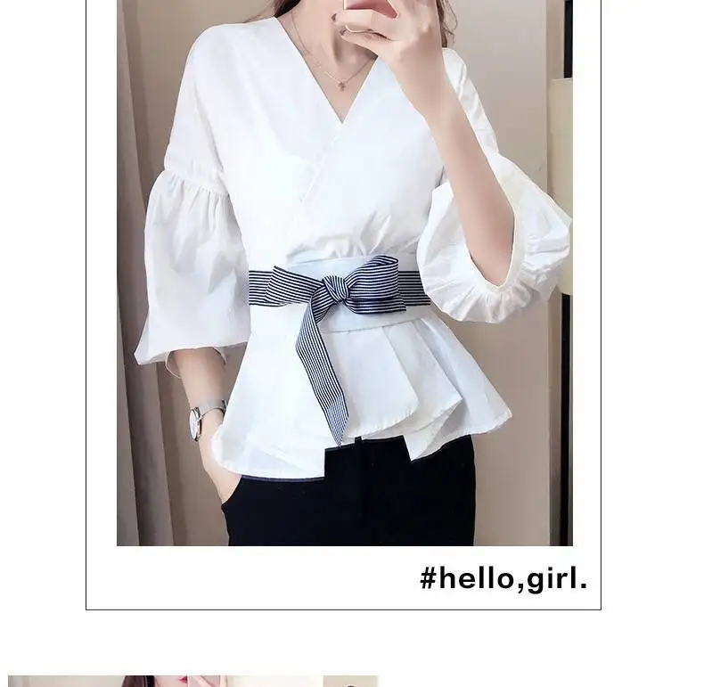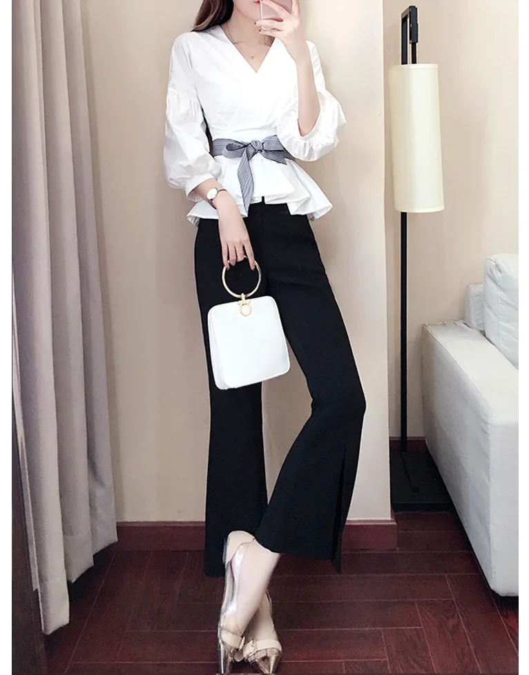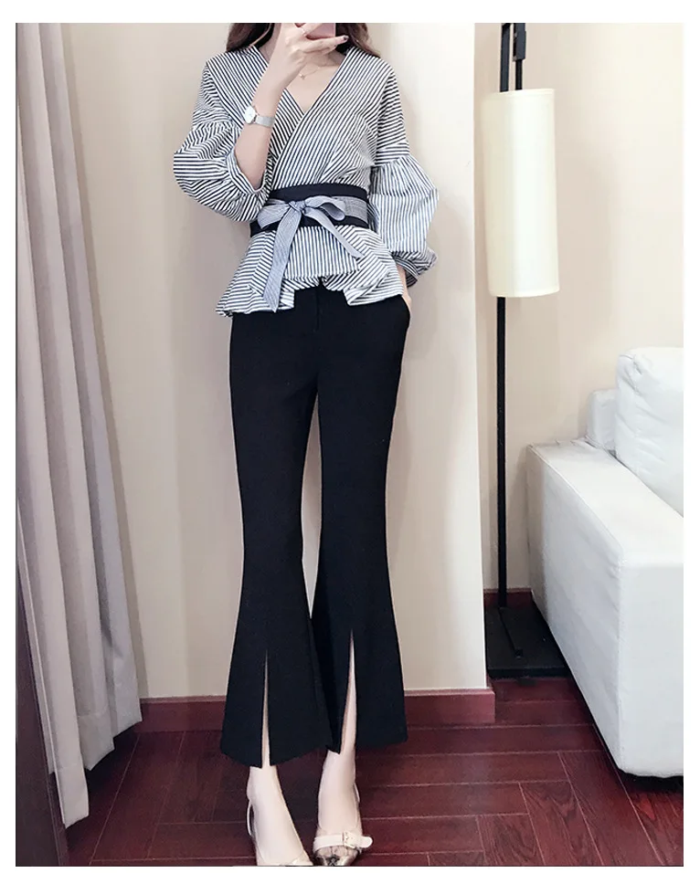 Женский комплект из 2 предметов, новая рубашка в полоску и широкие брючный костюм с ремнем, Женская офисная одежда с длинными рукавами