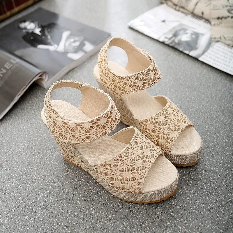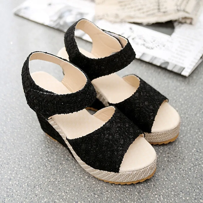 Женские босоножки на танкетке, однотонные повседневные сандалии-гладиаторы с открытым носком и кружевом, на липучке, лето 2019