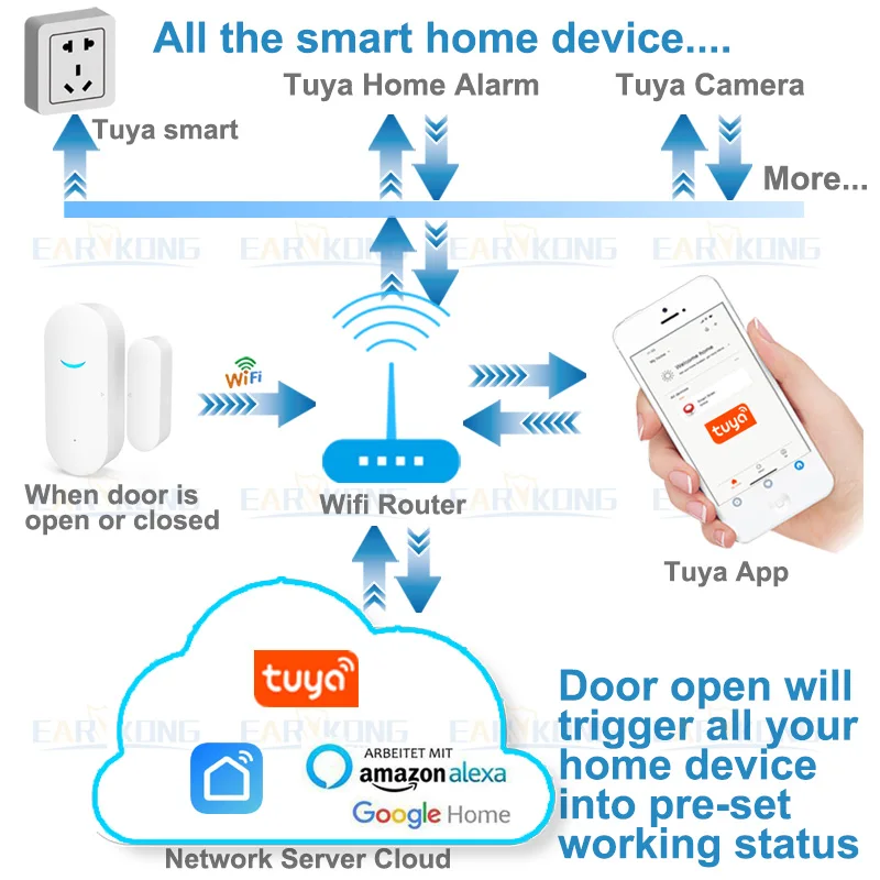 Датчик для обнаружения открытия и закрытия дверей и окон. Этот детектор имеет небольшие AAA батареи, которые легко получить. Совместим с Умной системой жизни или вашим. Совместимость с системой Alexa. В моем доме я включаю входной свет или активирую Сирена.