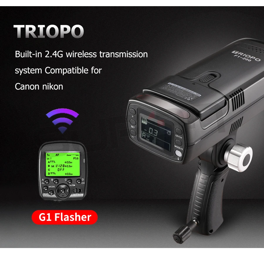 Беспроводная система TTL полностью совместима: со встроенной беспроводной G-системой TRIOPO 2,4G, она может поддерживать CANON E-TTL,NIKON I-TTL и другие автоматические системы вспышки TTL; может использоваться как ведомый блок беспроводной системы вспышки mulit-lamp, съемка простая и быстрая.