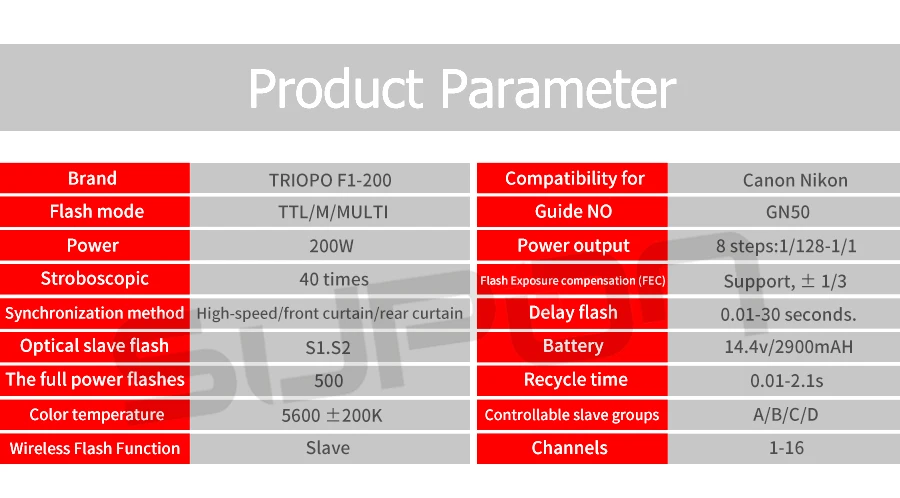 Вспышка F1-200-это Беспроводная Вспышка TTL со встроенной беспроводной G-системой 2,4G, с помощью этого G-триггера можно дистанционно управлять функцией TTL/M/Multi mode F1-200 вспышки, В то же время, он также может использоваться в комбинации с функцией вспышки TTL master-slave, вспысветильник TTL для наружной вспышки и студийным вспышкой TTL, со вспышкой F1-200, Вы получите более простую съемку благодаря изменениям освещения cmplex, точная вспышка автоматически получается для легкой съемки.