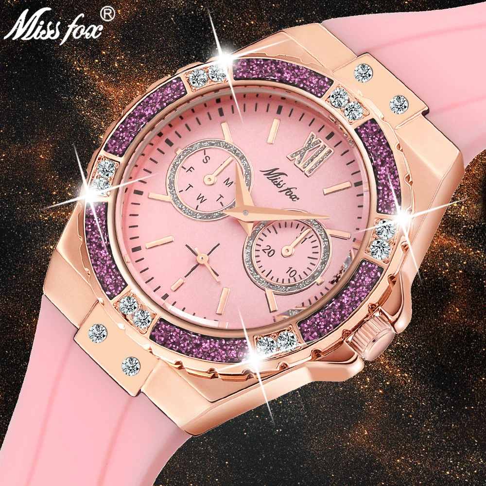 Часы Missfox женские кварцевые с хронографом, роскошные модные, со стразами, розовое золото, с резиновым ремешком, 2019