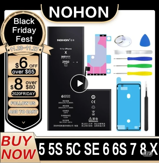 Новый аккумулятор NOHON для iPhone 7, 8, 6, 6S, 5 5S X, XR, XS, SE,...