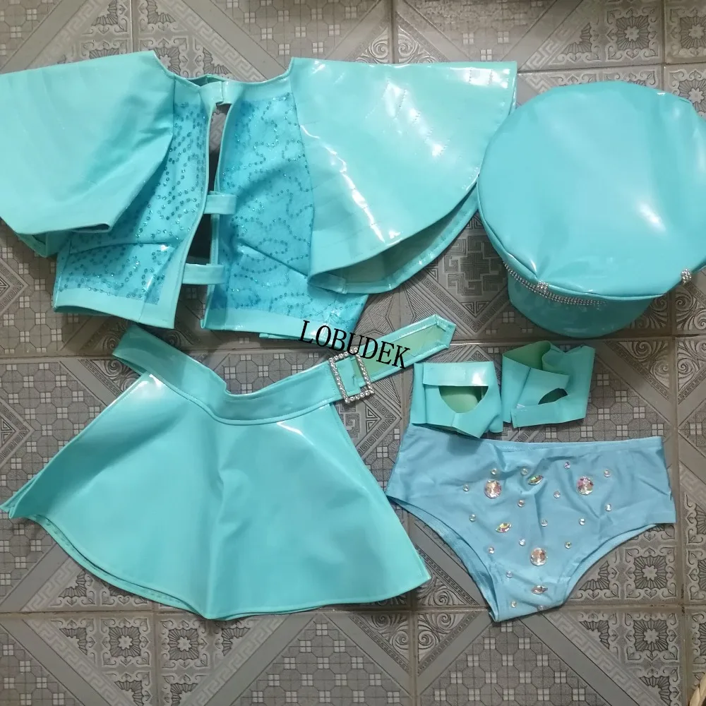 (Шляпа + топы + шорты + пояс + перчатки) Женский комплект бикини с синими кристаллами сексуальные сценические наряды DJ певицы ведущий танцор Джаз танцевальный костюм