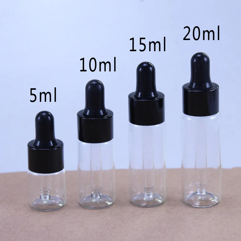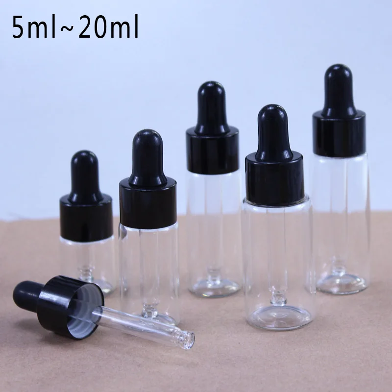 10 шт.лот 5101520 мл прозрачная стеклянная бутылка-капельница с черной крышкой, портативная стеклянная пипетка для глаз, бутылка для эфирного масла для ароматерапии