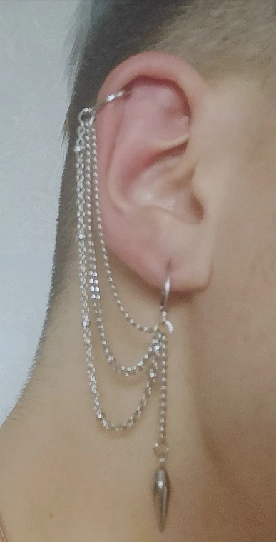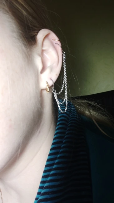 Металл хороший, блестит. Брала с клипсой на одной стороне и серьгой на другой. Клипса надёжна. Когда надеваешь впервые, немного болезненные ощущения. Но они быстро проходят. Когда надеваете шапку или другой головной убор, будьте аккуратны: клипса может слететь. Серёжка тоже надёжная. В целом, классная вещь и смотрится красиво