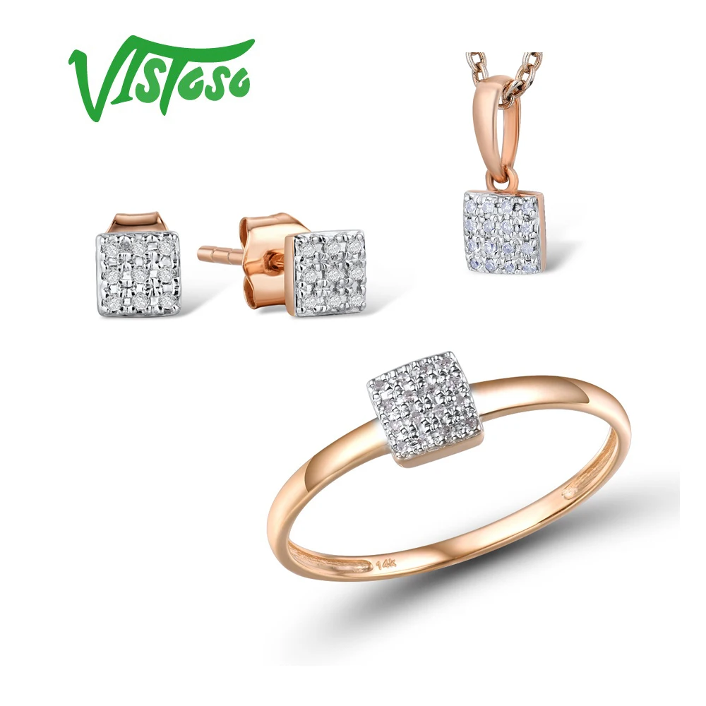 Женский комплект украшений VISTOSO, из розового золота 14 к 585 пробы, квадратные серьги, кольцо и подвеска, со сверкающими бриллиантами, модные ювелирные украшения из драгоценных камней