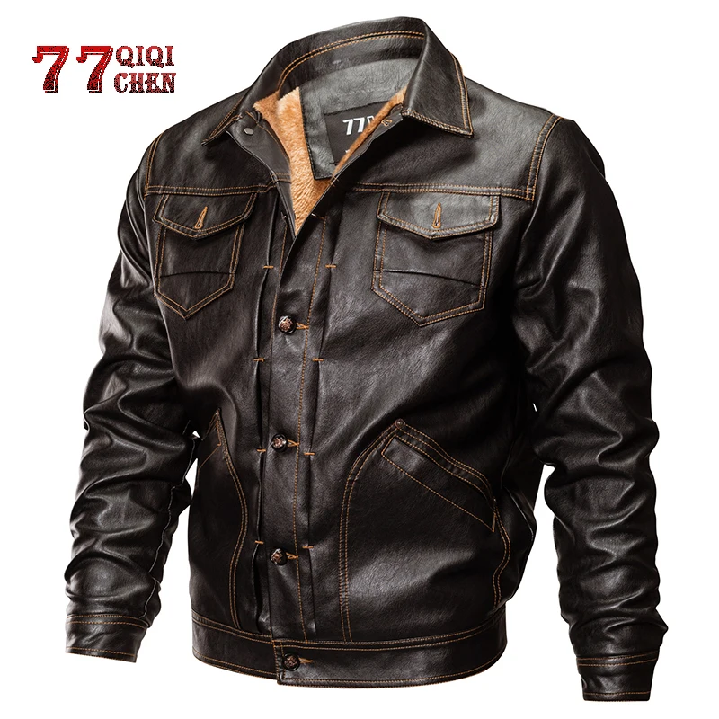 Мужская куртка-бомбер из ПУ кожи, с шерстяной подкладкой